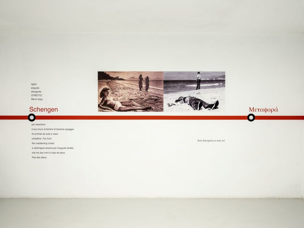 Eterogenei sono i lavori, in primis quello intitolato Walls, che troviamo all’Accademia di Spagna. Un muro, appunto, una doppia installazione realizzata con un doppio testo. Da un lato vengono proiettati filmati delle videocamere di sicurezza della città dei Melilla, con sotto i dati di un canale televisivo con messaggi di alta finanza, dall’altro lato, invece, lo spazio di frontiera di Tijuana e Melilla, e sotto le immagini la poesia Mura di Kavafis: «Senza riguardo, senza pudore, né pietà, m’han fabbricato intorno erte, solide mura. Ed ora mi dispero, inerte, qua. Altro non penso: tutto mi rode questa dura sorte. Avevo da fare tante cose là fuori. Ma quando fabbricavano come fui così assente? Non ho sentito mai né voci né rumori. M’hanno escluso dal mondo inavvertitamente».