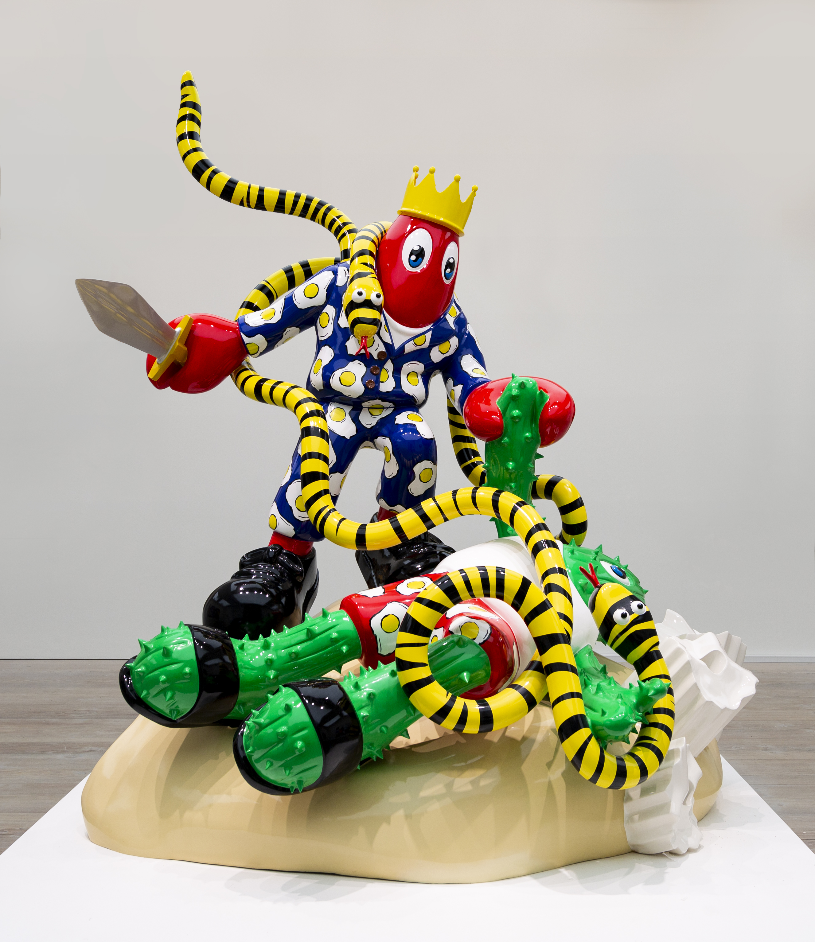 È proprio il tema del dialogo tra passato e presente a caratterizzare l’intera operazione; molti dei lavori più interessanti dell’artista nascono infatti da un approfondito studio della storia dell’arte, punto di partenza per Colbert per incrociare i temi dell’arte antica e dell’antichità classica con i simboli quotidiani della cultura di massa. Il risultato è uno scontro anacronistico: nelle sue scene di battaglia e di caccia che ricordano Paolo Uccello, si ritrova l’aragosta in posa eroica a combattere il Minotauro, a tagliare la temibile testa di Medusa o a superare valorosamente il serpente come Laocoonte, l’icona prototipica dell’agonia umana nell’arte occidentale.