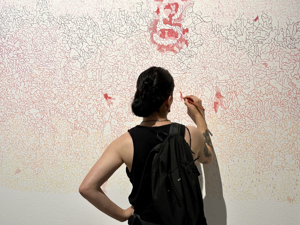 Un’estraneità che si può legare a un disagio interiore, a una condizione fisica, a una migrazione, a una lotta contro i pregiudizi e le ingiustizie quotidiane. L’estraneità rispetto a un percorso di vita obbligato dai dogmi sociali rappresenta uno degli spunti di riflessione dell’opera pittorica di Giulia Osella, dal titolo 00:11. Lo schema compositivo, tramite linee che si incrociano, conduce lo spettatore al punto in cui ci si libera metaforicamente delle aspettative realizzando un’esistenza propria.