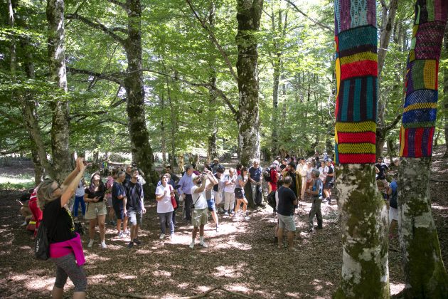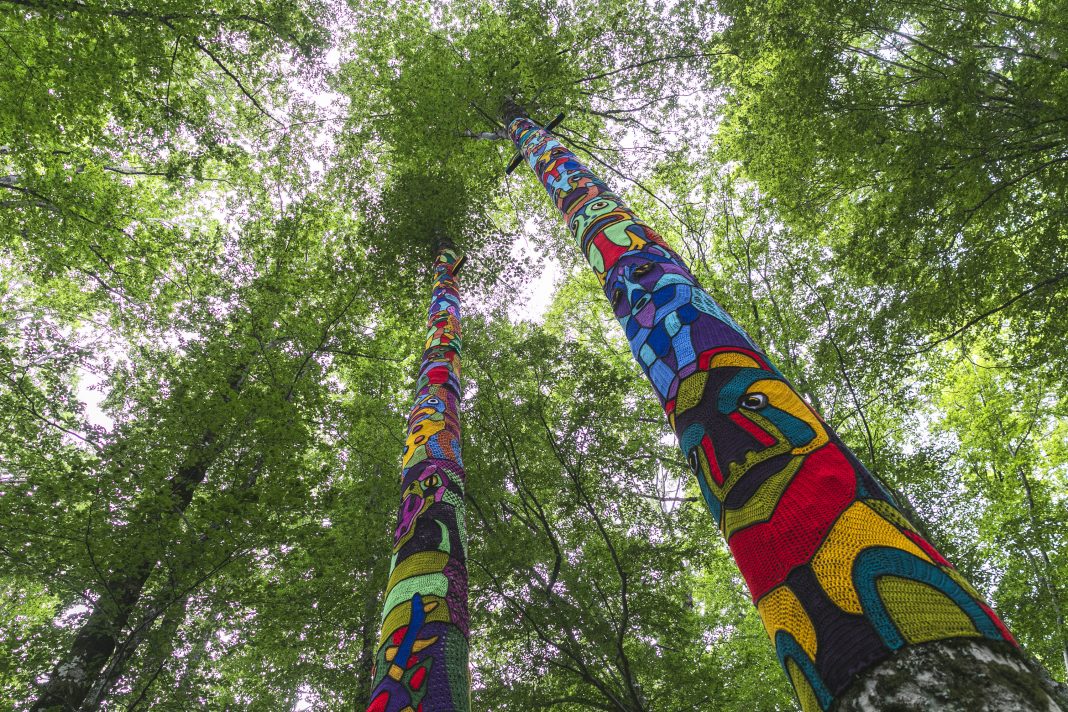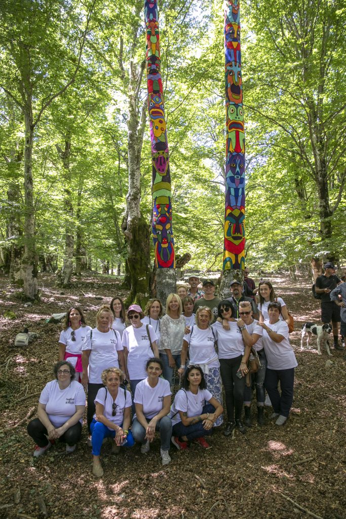 Totemi è un’opera di yarn bombing, arte urbana che si caratterizza per l’uso di tessuti o stoffe colorate, però in questo caso inserita in un contesto naturale. Seguendo i sentieri C1 e C2 all’interno del Parco si giunge al cospetto di questi due faggi di cui il lavoro del collettivo ricopre una superficie lunga circa dieci metri. L’artigianalità e il lavoro femminile sono le due componenti principali di quest’opera, portavoce di una tradizione preziosa e antica molto diffusa nelle terre d’Abruzzo, dove le donne in passato lavoravano riunite a pizzi e merletti, con lo strumento del tombolo.