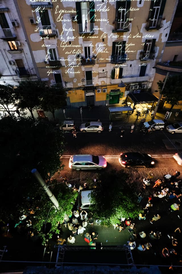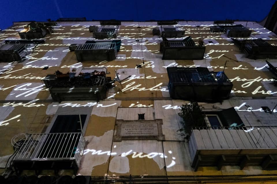 «Sempre caro mi fu», la signora con i capelli neri legati in una crocchia strettissima recita ispirata, muovendo ariosamente le braccia nell’aria calda e umbratile della primissima serata. La ascolta un ragazzo, che traduce in tempo reale a beneficio dei suoi amici, un poco in disparte, vestiti più o meno allo stesso modo, traslando in Sinhala le parole di Leopardi e della donna, «Questo è Leopardi, grande poeta. Ma come, non lo conoscete?». La lingua cristallina e ufficiale dello Sri Lanka circola densamente, in forma orale e anche scritta, tra manifesti incomprensibili ai più, insegne di minimarket e menù di piatti da asporto, in tanti quartieri del centro storico di Napoli, attraversando le stesse strade che percorreva il grande poeta, scrittore e filosofo, aprendo gli stessi portoni. Giacomo Leopardi trascorse gli ultimi mesi della sua vita in vico Pero, nel cuore del quartiere Stella, Rione Sanità, prima di morire per idropisia, il 14 giugno 1837. E la sua grafia scorre ricca di sfumature ed effetti, come un linguaggio che si fa mondo, le parole tracciate di suo pugno, conservate e riscoperte e rilette, illuminano l’impaginazione di quel “suo” palazzo che si apre sull’affollatissima via Santa Teresa degli Scalzi, la strada principale della Sanità, costruita proprio in quegli anni, secondo il progetto urbanistico di Giuseppe Bonaparte e Gioacchino Murat. «Ranieri mio, le carte ove l’umana vita esprimer tentai», proiettate sulla casa che fu di Leopardi come venature dorate, ma più come un frammento del kintusgi che nella fredda preziosità dell’intarsio, considerando le condizioni ormai malandate dell’abitazione, le raffinate costruzioni sintattiche leopardiane tratte dai “Nuovi Credenti” segnano una presenza, anzi, una compresenza: Voi siete qui è il titolo dell’installazione presentata il 15 giugno nell’ambito dell’ampio Progetto di Artista Abitante, con il quale da Eugenio Giliberti sta ripercorrendo le vicende di Leopardi a vico Pero 2, evocandone le storie per attivare un processo di rigenerazione diffuso in questa area urbana. A partire dal riconoscimento di un’appartenenza nella sua accezione ampia, di condivisione di sensazioni e momenti, di scorci paesaggistici e antropici, di radici e di prospettive che da Recanati potrebbero aprirsi, magari, anche verso un’isola nell’Oceano Indiano e che, lungo il tragitto, portano alla scoperta di un quotidiano dai tratti di meraviglia. Come l’Istituto Paolo Colosimo, dove si è tenuta la presentazione del progetto e dell’installazione, dando anche l’occasione di conoscere uno degli istituti più importanti d’Italia per l’avviamento al lavoro e la scolarizzazione dei ragazzi privi della vista, con la sua grande collezione di telai d’epoca, tra gli altri oggetti di pregio lì conservati.