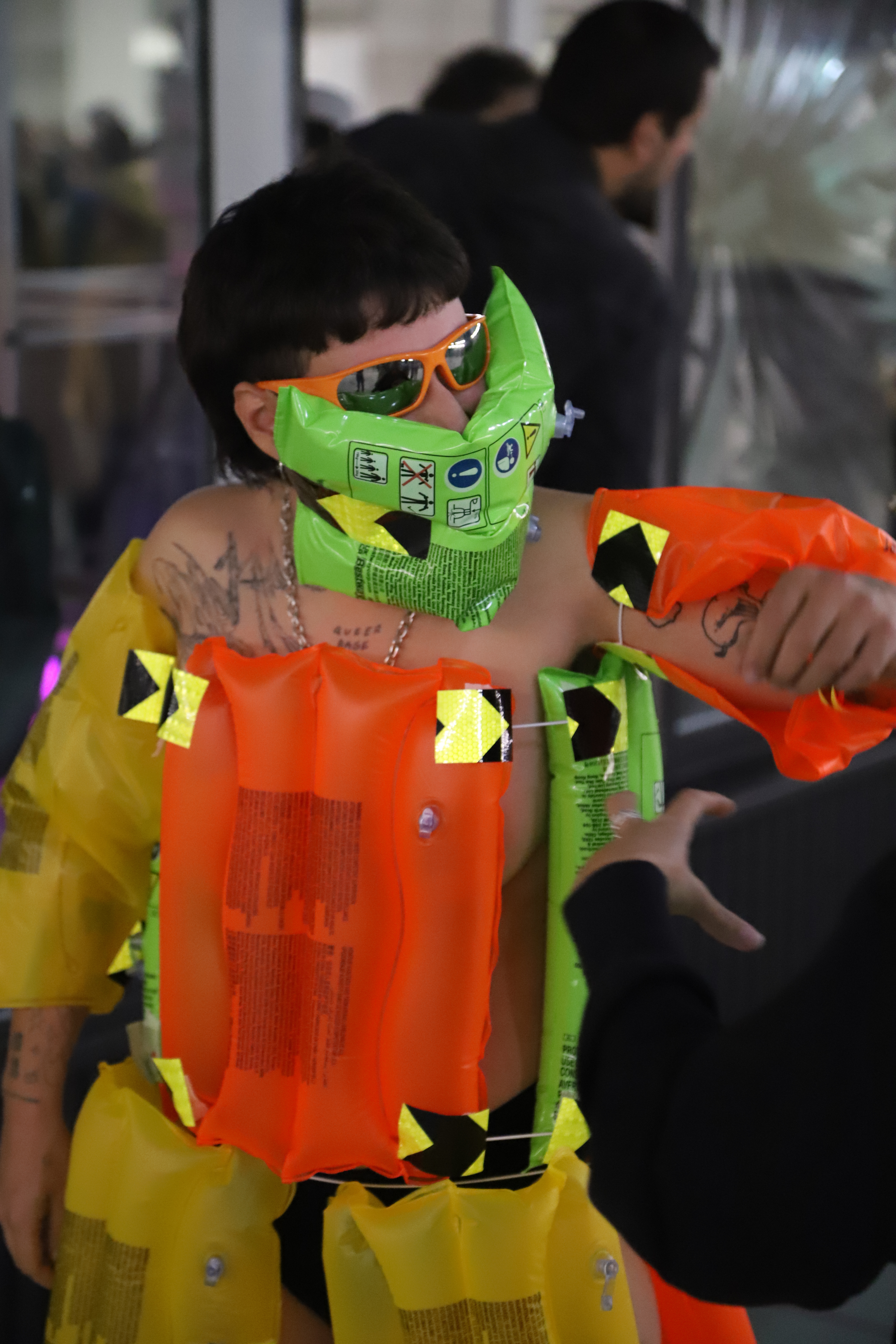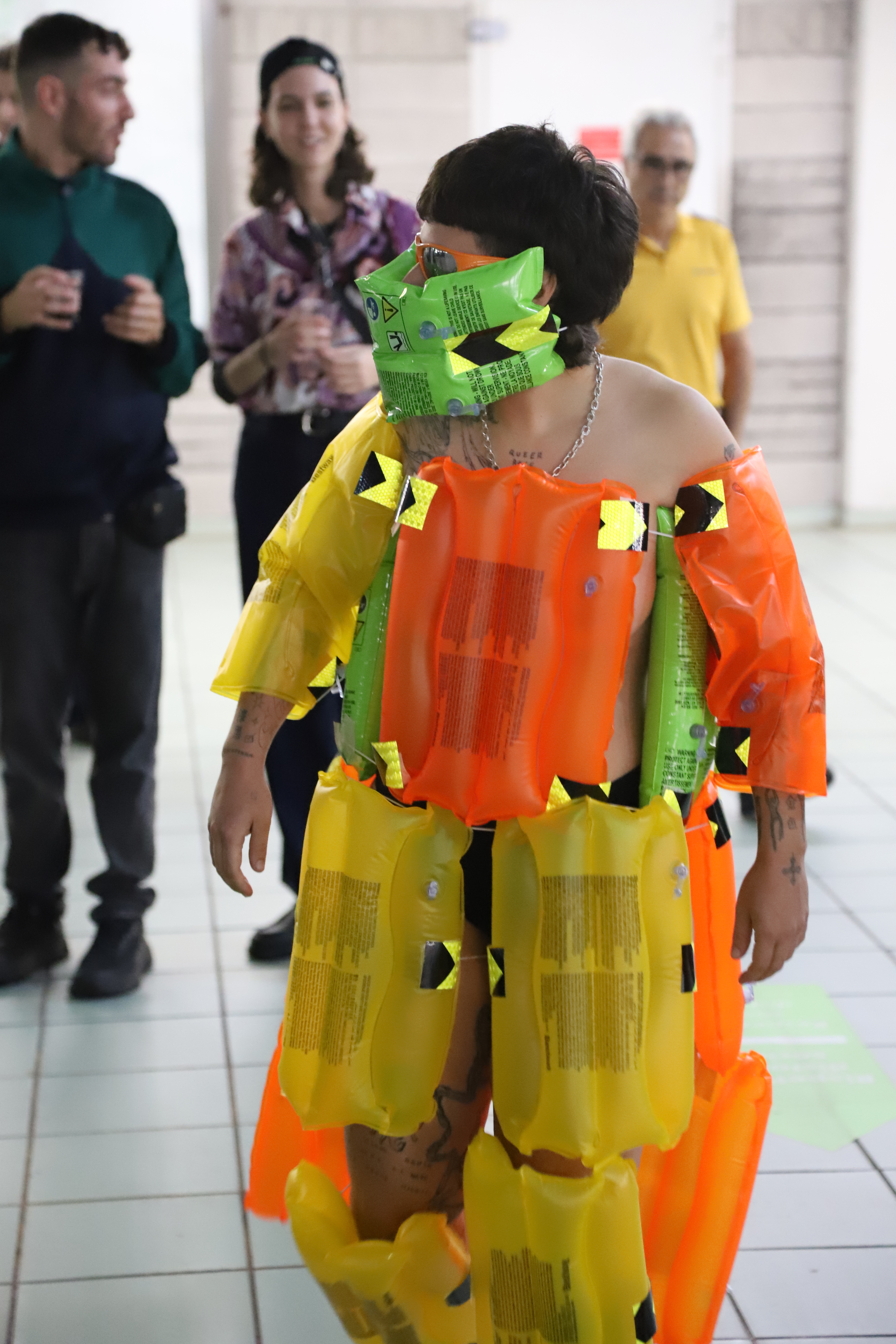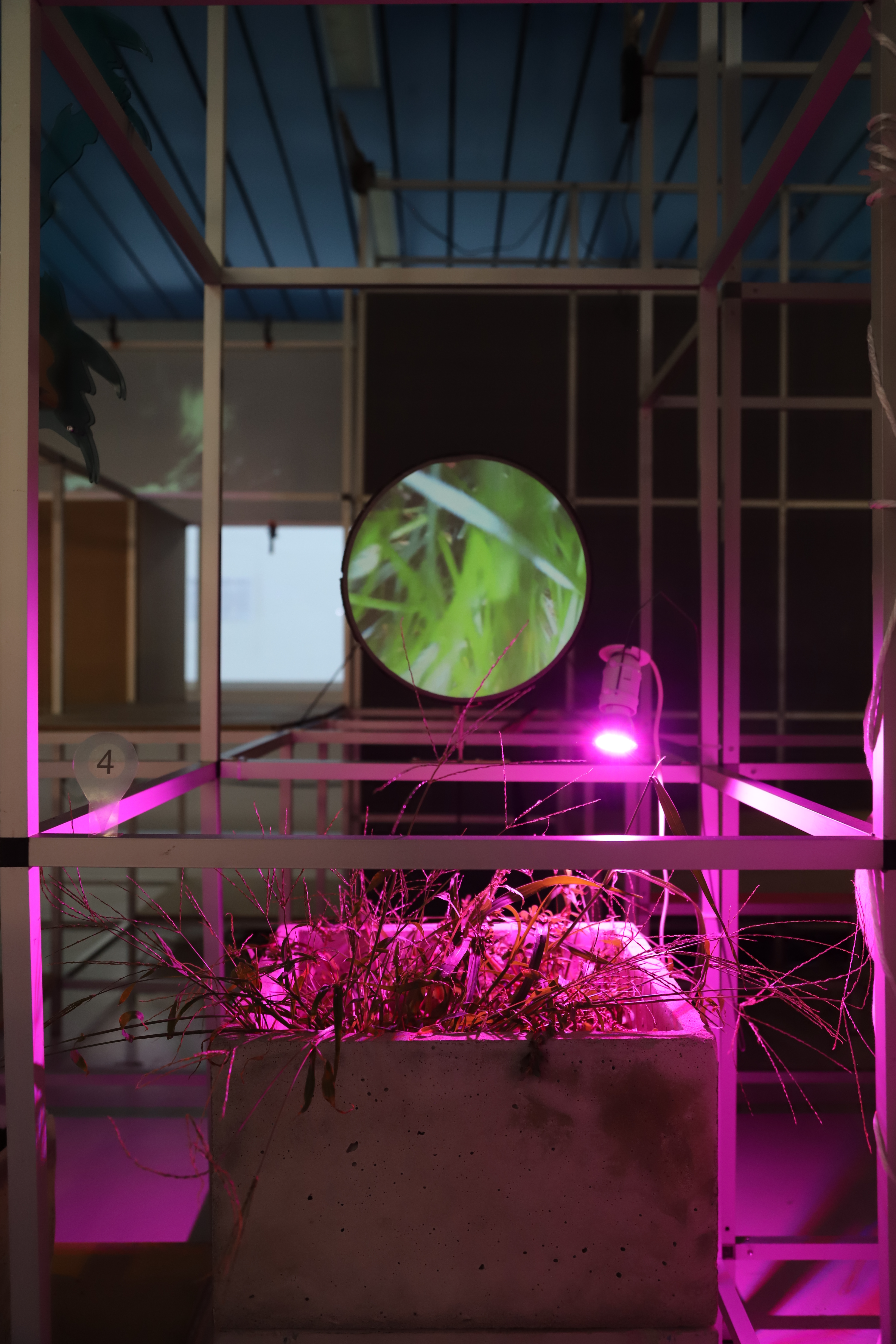 Ecco allora che mi sono ritrovato davanti a una casa di vetro, con lunghe finestre a nastro che non lasciano nulla in segreto. Una figura mostruosa si aggirava dentro e fuori l’abitacolo, con Cambio di Forma, Rebecca Mari performa un essere animato dai colori tropicali e dalle fattezze fluide. Dietro una finestra si mostra Lucrezia Costa con Atémnein, una struttura dall’aspetto antico, liquido, senza angoli e senza spigoli, una porzione di un sogno, un frammento di una città utopica. Accanto, quasi in una lotta di opposti, una piccola stanza nera, chiusa, intima, che custodisce e protegge degli organismi, delle minuscole alghe bioluminescenti dentro un’incubatrice. L’opera di Marco Cesari, Stressed Inversion, sottolinea la presenza disturbante dello spettatore, che attiva e rende manifesto l’essenza delle micro alghe.