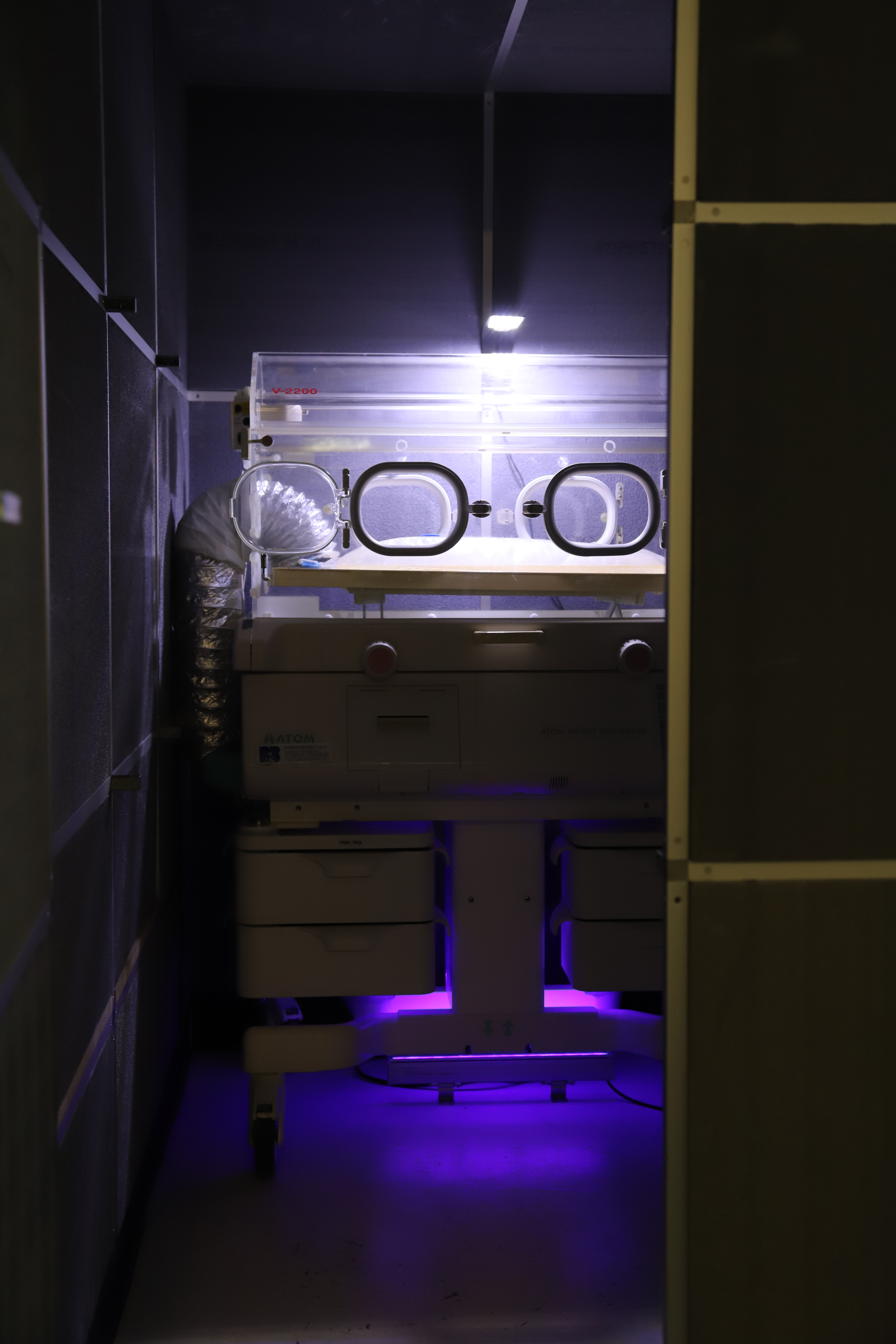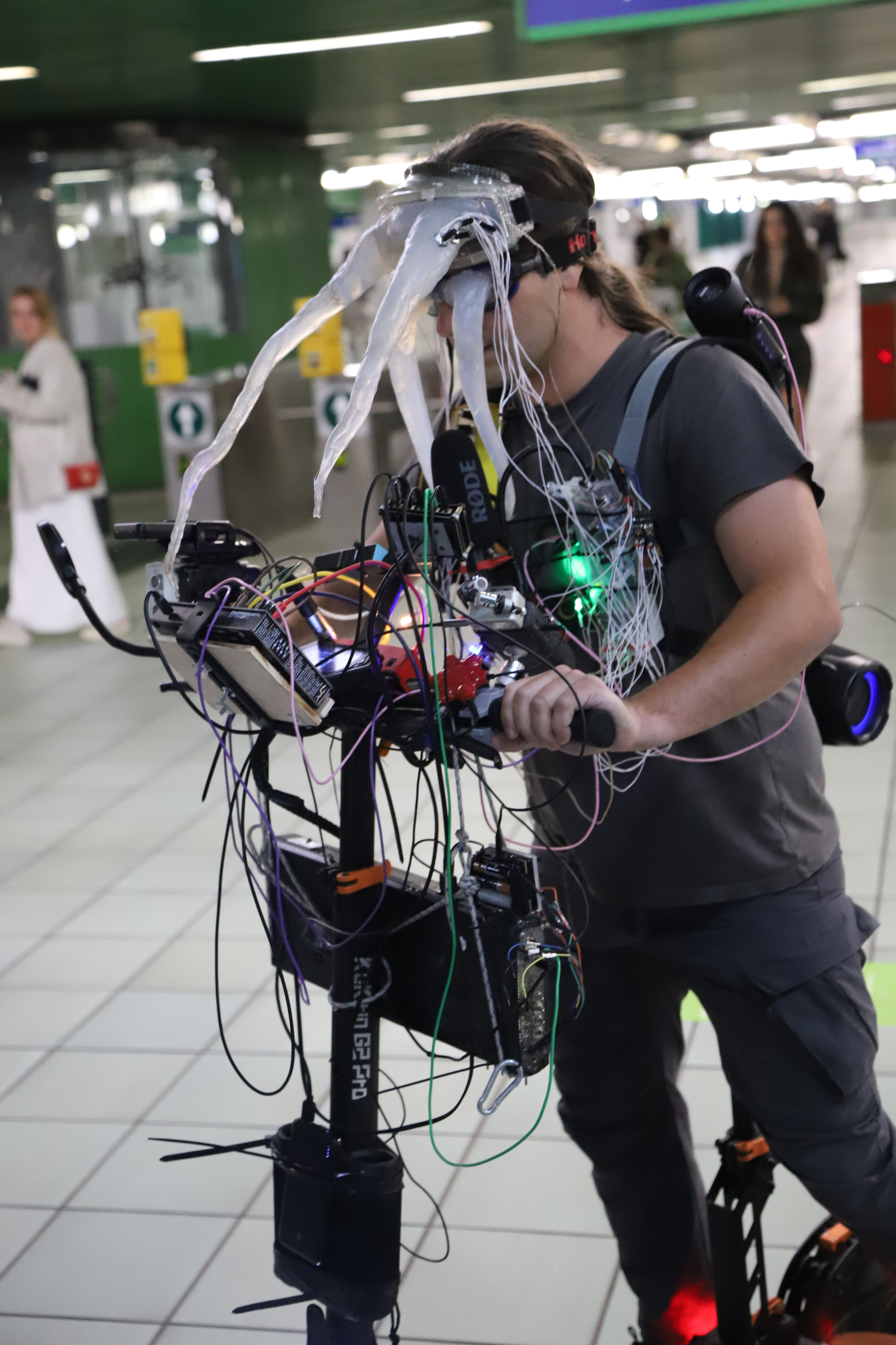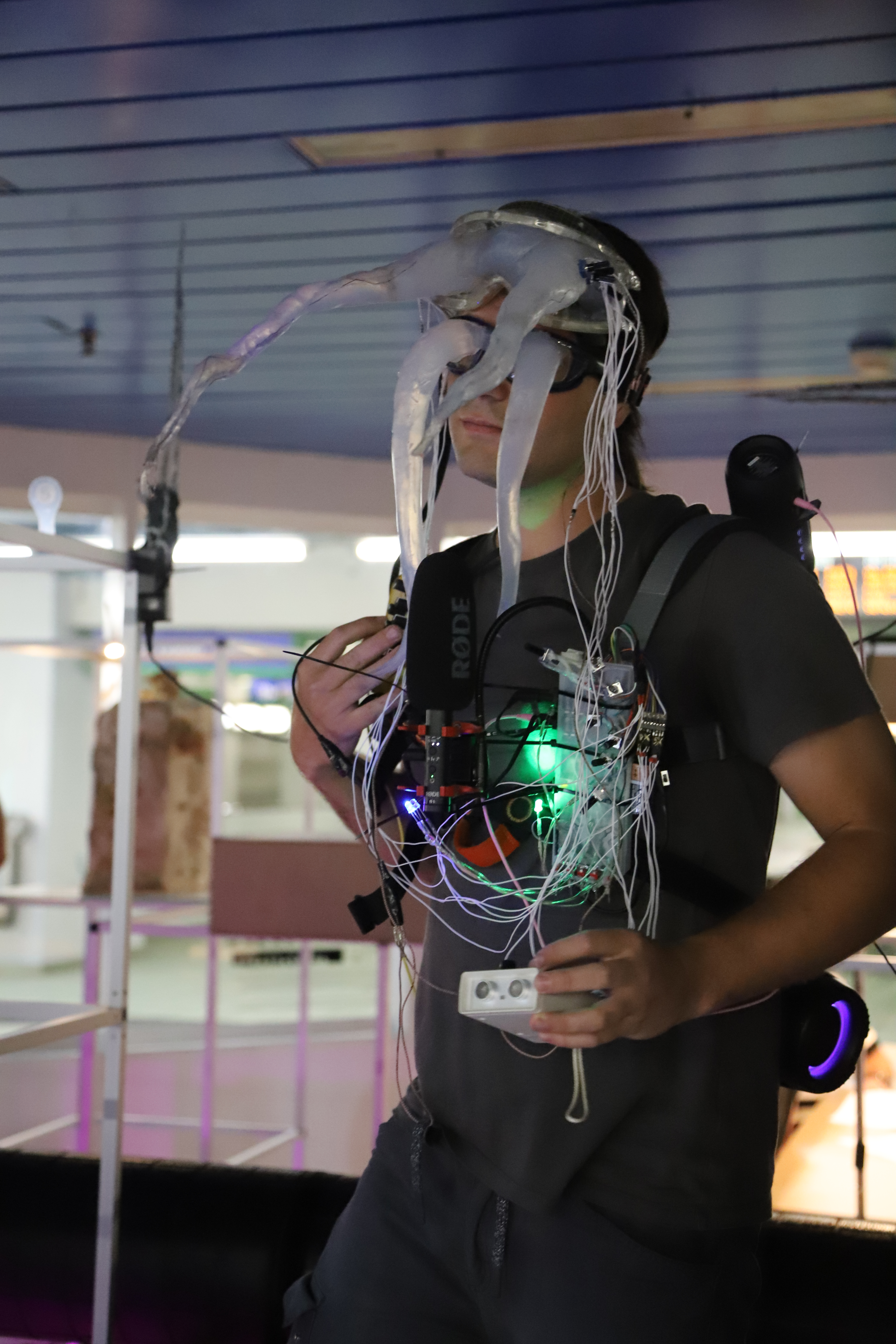 Ecco allora che mi sono ritrovato davanti a una casa di vetro, con lunghe finestre a nastro che non lasciano nulla in segreto. Una figura mostruosa si aggirava dentro e fuori l’abitacolo, con Cambio di Forma, Rebecca Mari performa un essere animato dai colori tropicali e dalle fattezze fluide. Dietro una finestra si mostra Lucrezia Costa con Atémnein, una struttura dall’aspetto antico, liquido, senza angoli e senza spigoli, una porzione di un sogno, un frammento di una città utopica. Accanto, quasi in una lotta di opposti, una piccola stanza nera, chiusa, intima, che custodisce e protegge degli organismi, delle minuscole alghe bioluminescenti dentro un’incubatrice. L’opera di Marco Cesari, Stressed Inversion, sottolinea la presenza disturbante dello spettatore, che attiva e rende manifesto l’essenza delle micro alghe.
