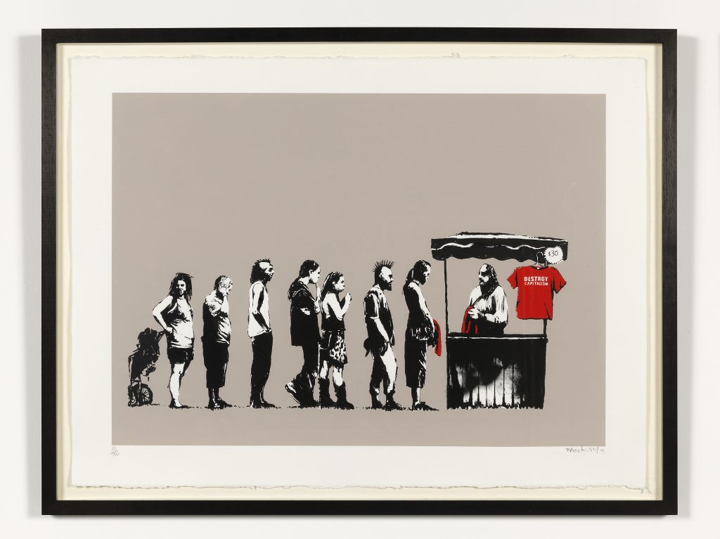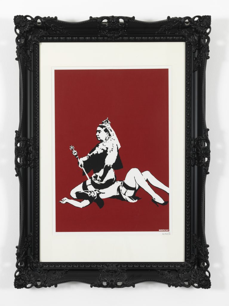 Ma Banksy è innegabilmente acuto, e questa mostra tende ad evidenziarlo. Crea l’iconico Love is in the air, e la molotov che manca al manifestante se la prende lui, per scagliarla contro un sistema elitario, da fautore di un arte alla portata di tutti; in Festival (Destroy capitalism) si lancia contro il capitalismo prendendo la via secondaria dell’anti-capitalismo all’epoca del merchandising, ricordando che le ideologie di ieri oggi si pagano alla cassa. Attacca la monarchia britannica, stigmatizza i cliché sociali e il rincoglionimento delle nuove generazioni. Ah, mentre attacca la monarchia – biasimando l’incoerenza di una Regina Vittoria promulgatrice di leggi contro l’omosessualità, e praticante lesbo-chic – è pure paladino arcobaleno.