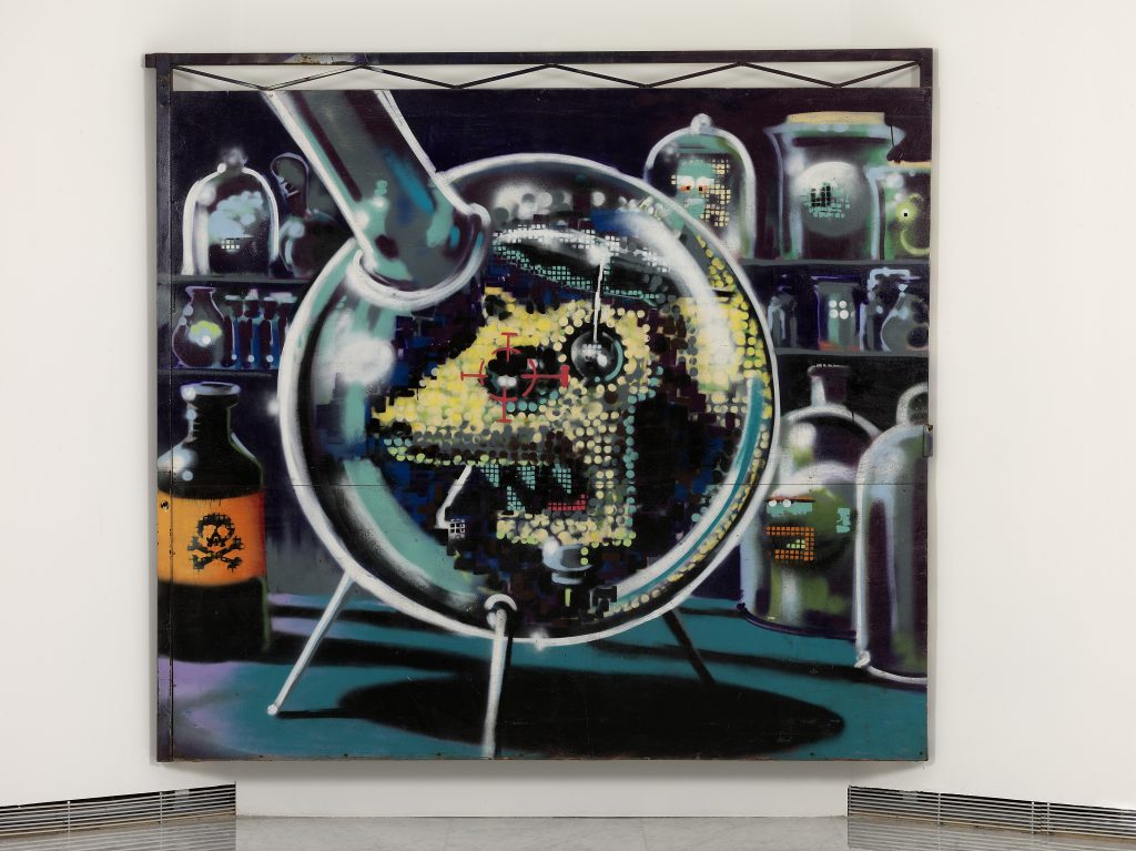 Alla fine s’impara che Banksy è il mondo dell’arte compresso in un solo nome, ma non uno street artist. O almeno non più. Più veloce di Jack Frusciante è uscito dal gruppo, con accondiscendenza, e questa mostra lo comprova. C’è un pezzo di palco, Lab Rat, legno dipinto a spray. È datato 2000, in tempi d’anonimato puro. Non stupisce perché basta essersi girati qualche periferia urbana per avere una sensazione di déjà vù. Per quanto riguarda i contenuti sicuramente c’è il topo-topos allegorico, imprescindibile nell’universo Banksy; c’è un mirino, altro elemento che Antonelli individua come caratteristico di lì a venire. Antonelli però fa anche un’altra cosa, giusta per un curatore intento nell’esegesi di chi sta curando, ma insolita se ci si ragiona su: accentuando il poco appeal degli esordi, apostrofa l’opera con un «Vi sembra Banksy?».