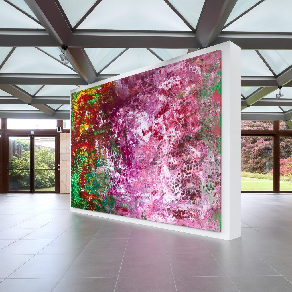 Un equilibro instabile e precario che tuttavia diventa espressione di vitalità inesauribile nelle opere di Roberto Coda Zabetta, il quale realizza un grande dittico monumentale che attraversa lo spazio del museo di impresa biellese, contornato da dipinti di diverse scale e grandezze. <<Molti parlano di astrazione, ma in realtà per me queste rimangono opere figurative, talmente immersive che si ha la sensazione di potersi tuffare al loro interno e trovare ciò che si stava cercando>>, dice, davanti alle esplosioni di colore sparse sulla tela. In questa nuova serie, la sua tecnica pittorica è stata oggetto di una nuova sperimentazione, ottenuta creando concentrati pastosi di colore che sono stati fatti “esplodere” tramite dell’aria compressa. <<Ci metto tanto a concepire un’opera, ma poi l’esecuzione è molto veloce. Il tempo necessario, una volta stesa la pittura, sta nell’attesa che l’opera “risponda”>>. Il risultato è in parte inaspettato e incontrollabile, un “giardino selvatico” ora seducente e sensuale, ora intenso e drammatico. Aggrovigliato su se stesso, resta inestricabile a tutto tranne che alla vista attenta dell’osservatore.