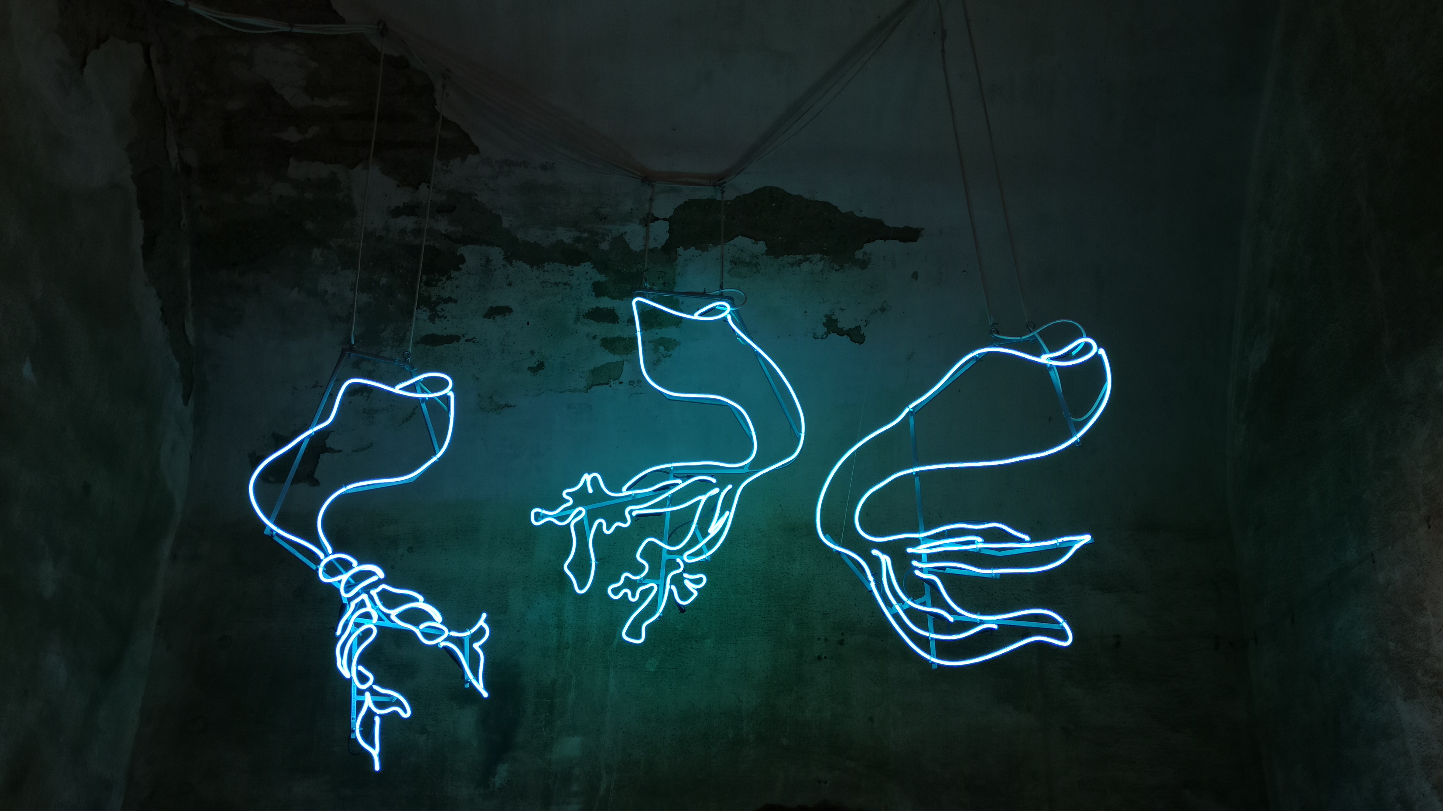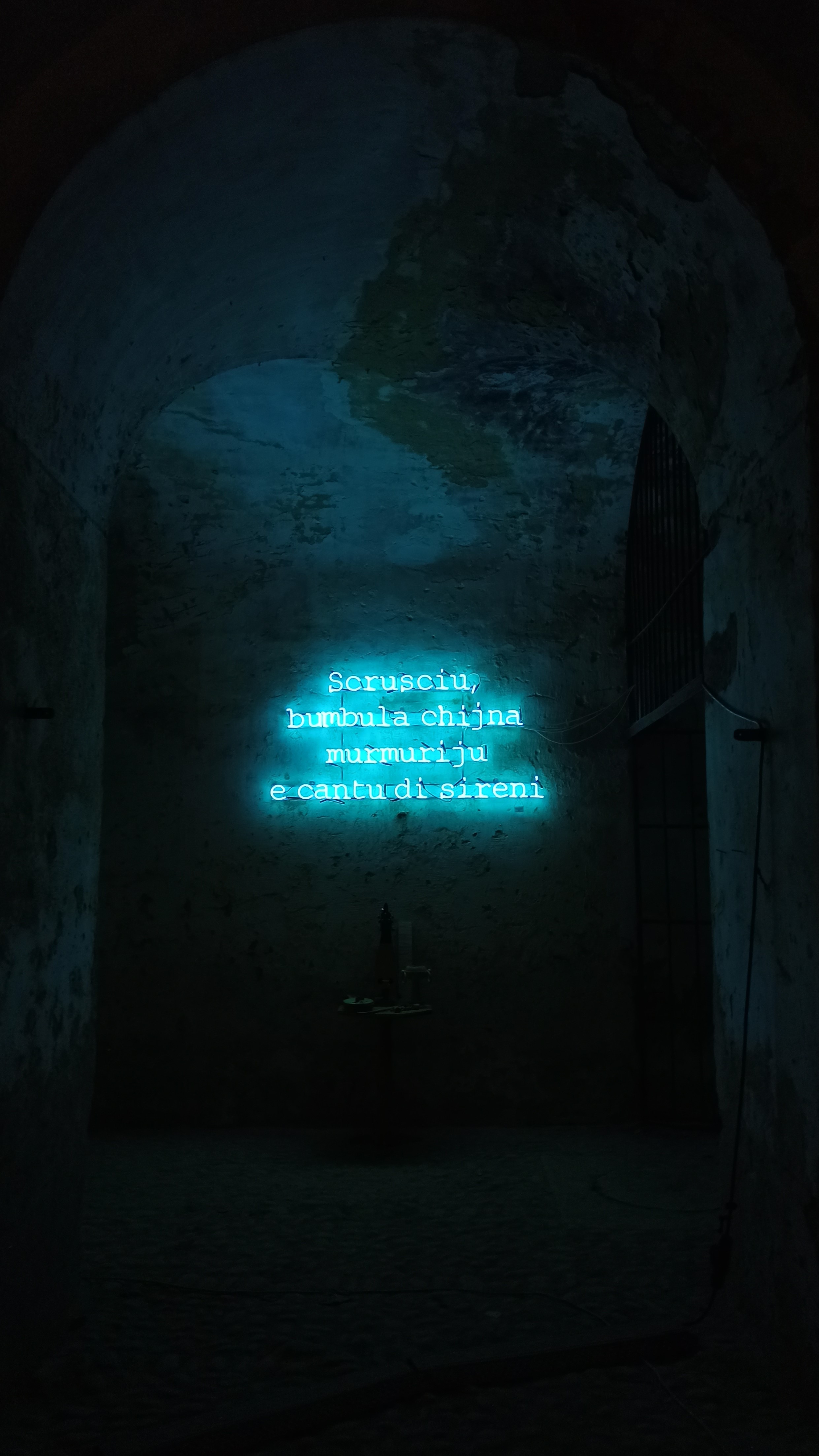 Tra le opere presenti nel padiglione calabro della Biennale dello Stretto, vi è una costante di operazioni realizzate mediante l’impiego di neon e luci. Diversi gli interventi site specific che contengono brevi frasi diffuse nel percorso, realizzate con neon colorati: l’inarrestabilità del pensiero viene paragonata alla vastità dell’oceano, vi sono riferimenti alle forme di vita che abitano il mare partendo dalla fauna reale, passando poi a figure mitologiche quali le sirene, per poi giungere con una suggestiva allegoria ai migranti con la frase al neon rossa che si riflette su uno specchio d’acqua recitando: “qui non sbarcherà mai nessuno”.