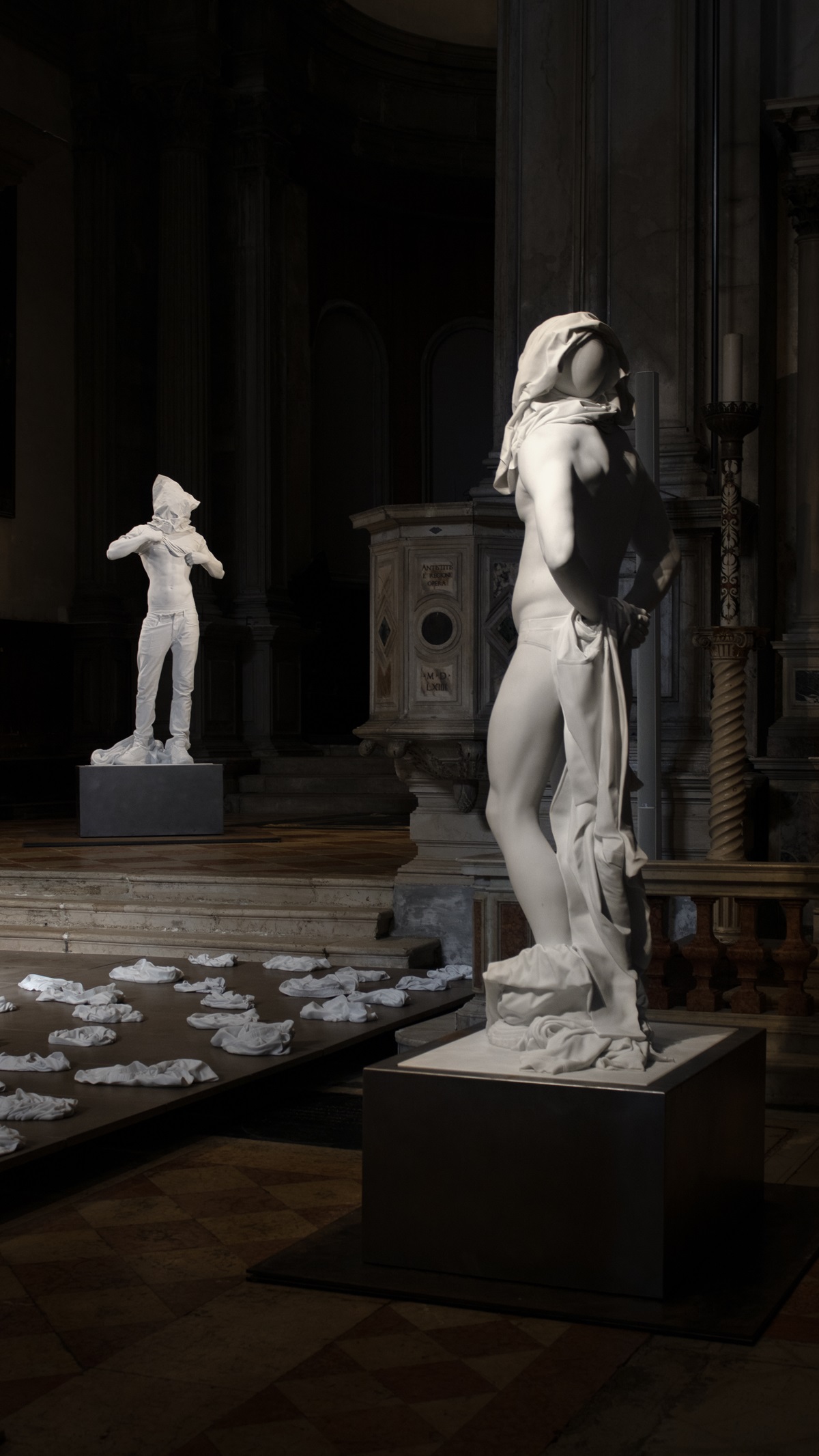 Poco lontano dal Museo Correr, accanto al Teatro La Fenice, la Chiesa di San Fantin ospita NUMBER 207, la personale di Reza Aramesh, a cura di Serubiri Moses. L’artista iraniano torna a Venezia dopo la 56a Biennale, con la sua prima personale accompagnata da due pubblicazioni di SKIRA editore. In mostra, tre serie di sculture incontrano l’ambiente suggestivo della chiesa. Il focus del progetto è il lavoro Study of Sweatcloth as an Object of Desire composto da 207 elementi in marmo di Carrara, adagiati sul pavimento e scolpiti in modo tale da emulare la biancheria maschile. La chiesa veneziana, un tempo sede di reclusione per i condannati a morte, fa da sfondo alla ricerca di Aramesh che attinge a immagini d’archivio e reportage di guerra, con un riferimento diretto ai condannati di oggi e alle loro torture.