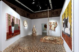 Per me, la mostra alla Biennale di Venezia è il culmine di riflessioni sulla riverenza per l’immaginario moderno nell’Africa postcoloniale. Le opere d’arte in mostra sono una fusione di stili pittorici moderni con elementi di collage come il tessuto di corteccia dell’Uganda e motivi che incarnano diversi aspetti della mia creatività, materialità e decoro.