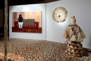 Io faccio quello che ho appreso e osservato crescendo. No, parlare di “un’identità africana femminile” è una generalizzazione pericolosa vista da una lente bianca. Specialmente in relazione all’intrecciare, filare, l’appendere, lo stirare fibre naturali. Gli uomini lavorano e intrecciano secchi, tetti, in ambienti rurali. Dipende dai compiti del momento. Molti dei lavori artigianali con fibre naturali coinvolgono questi compiti, non si può generalizzare necessariamente un intero continente femminile con questo lavoro. Specialmente in relazione a compiti domestici. Tuttavia una donna è un emblema nazionale di vita attraverso la sua vita naturale che dona essenza. Natura e umanità sono in un costante ciclo di convivenza. Le donne in questo caso esplorano e raccolgono nelle foreste e nelle zone umide. In tal modo contribuiscono alla potatura e alla manutenzione. Questi luoghi in cambio danno materie prime come palme e rafia e perline.