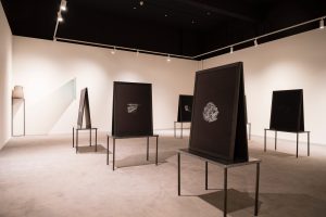Sto costruendo vari punti di riflessione con la mostra itinerante “Biomega Multiverso”. Il corpo centrale delle opere sono otto lavori serigrafici con ricamo, realizzati mediante i tracciati visivi recuperati dalla collaborazione con il Brain Lab – dipartimento di neuromarketing dello IULM di Milano, ma presso Camera ho presentato anche in dialogo una coppia inedita di vasi in ceramica. Le sculture sono state realizzate con la tecnica dell’ingobbio a partire dall’osservazione di fotografie di oggetti legati alla tradizione agricola, di cui si è perso l’uso, archiviate presso la Fondazione Museo Ettore Guatelli di Ozzano Taro Collecchio (PR). L’intero lavoro insiste sulle diverse modalità di percezione visiva, con l’obiettivo di indurre il visitatore a interrogarsi su quanto queste possano influire sulle sue scelte quotidiane di consumatore. Infatti sempre sulla tematica delle “immagini” a Kiev presenterò un lavoro inedito sull’importanza dell’azione dello sguardo quando si posa su un oggetto sollevando, in questo caso, un interrogativo importante sull’idea di rimozione della storia legata a monumenti e statue, e sulle nuove forme di occultamento e di negazione.