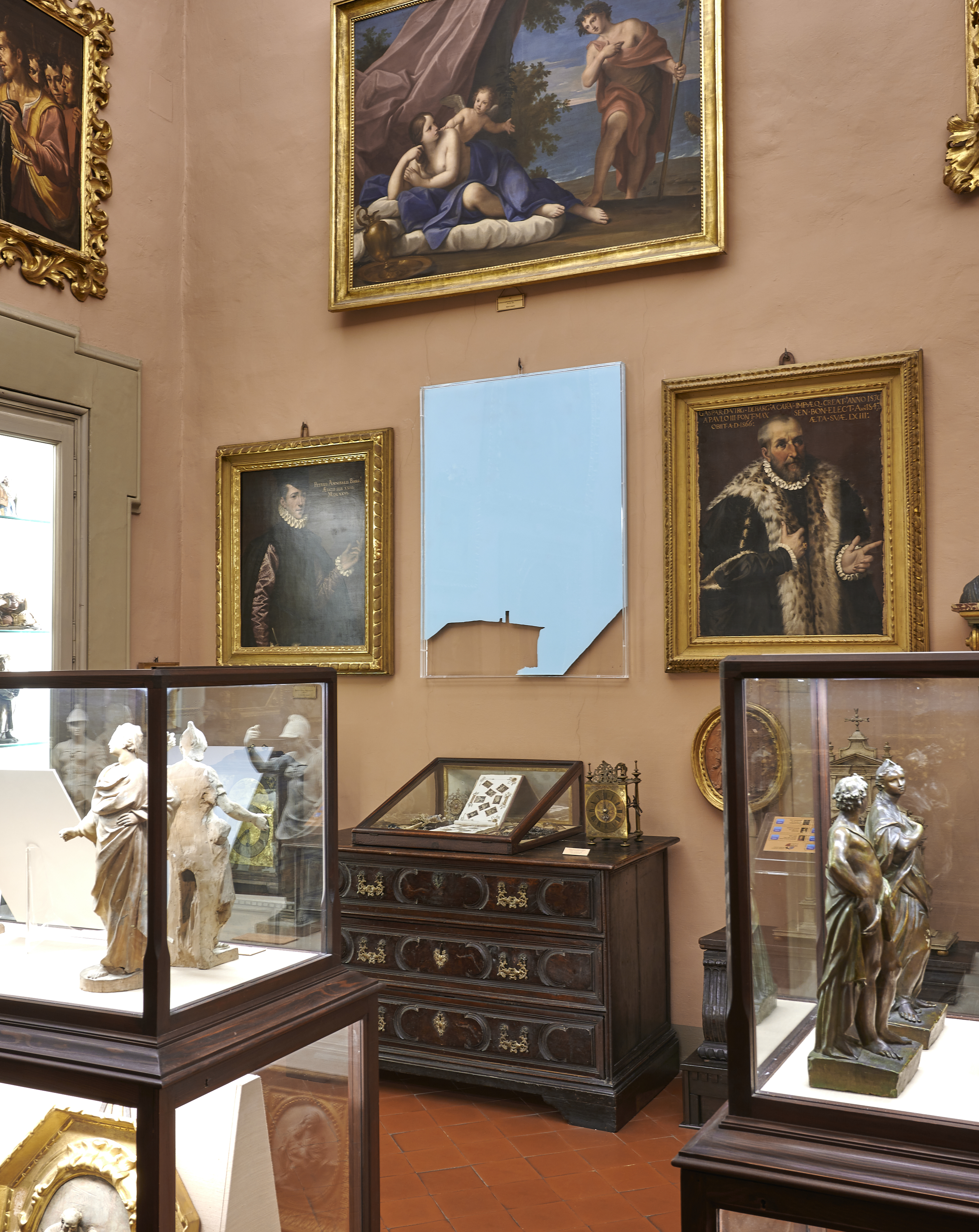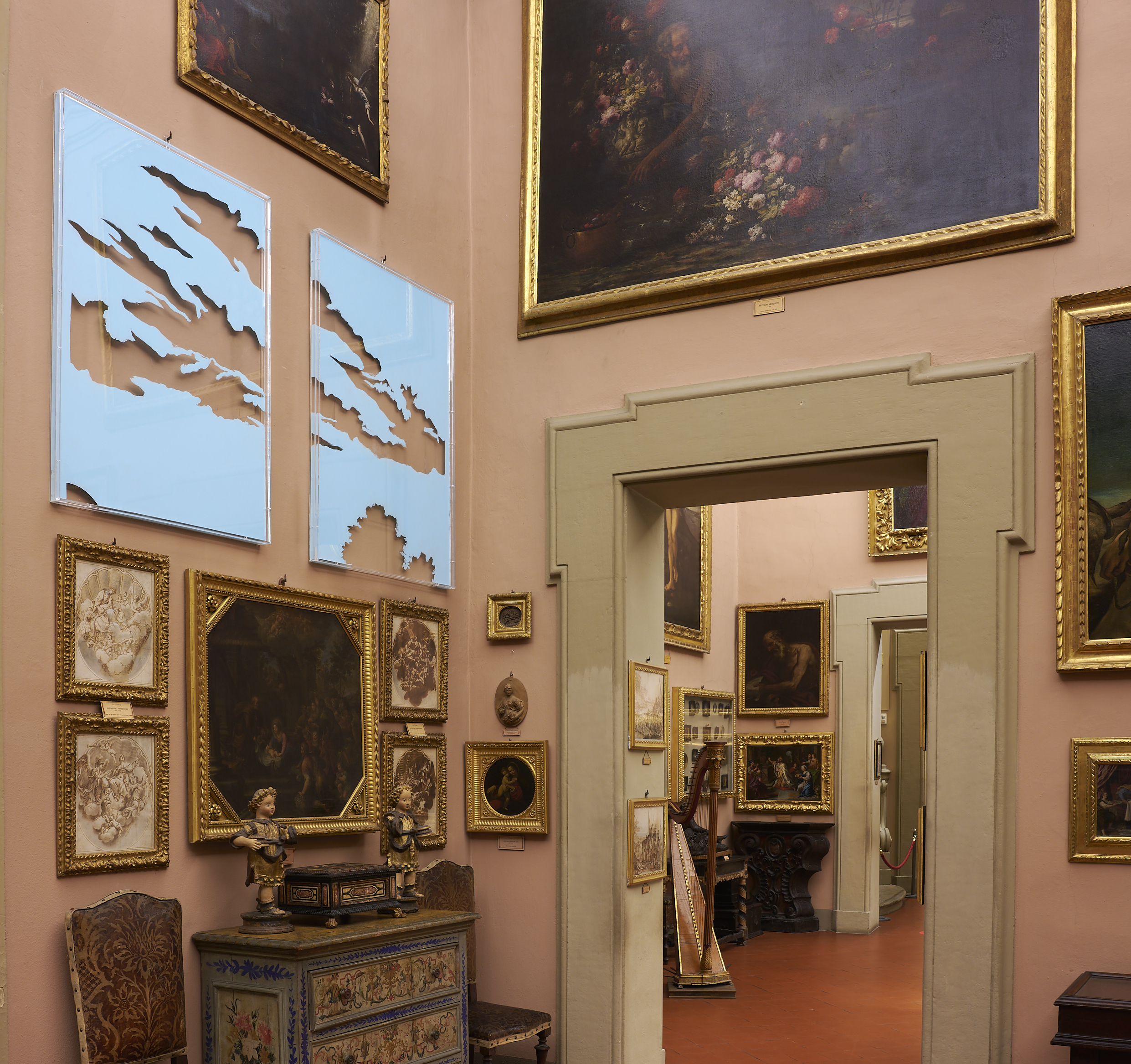 Usciti da Atelier Sì, attraversiamo a piedi Piazza Aldrovandi in direzione di Strada Maggiore, per giungere al Museo Davia Bargellini, dove, fino al 25 settembre, è ospitata FRESCO, mostra di Davide D’Elia a cura di Elisa Del Prete. L’intervento dell’artista – che indaga la relazione tra passato e presente, storia dell’arte e arte contemporanea, pittura accademica e “gesto” pittorico – è pensato in dialogo con la collezione del museo e i peculiari criteri che ne dettano il percorso espositivo all’interno del palazzo seicentesco dove è situato, raro esempio di collezionismo privato cittadino. La mostra si compone di otto quadri in plexiglas del ciclo FRESCO realizzati nel corso di un precedente intervento site specific operato da D’Elia nel 2018 sugli affreschi del Salone delle Feste del Palazzo Atti – Pensi di Todi, dimora cinquecentesca che si erge al centro della piazza principale della città umbra, che a Bologna vengono allestiti in relazione ai dipinti e alle sculture della collezione. La mostra a Bologna è completata da due nuovi interventi site specific, Zero e Zero1, su due dipinti della collezione del museo entrambi dal titolo Paesaggio con figure di Vincenzo Martinelli (fine sec. XVIII), esposte nella Sala 1. Zero e Zero1, nel momento in cui lasceranno il luogo originario del Museo Davia Bargellini per essere esposti altrove, attiveranno a loro volta un processo di traslazione portandosi dietro il contesto primario.