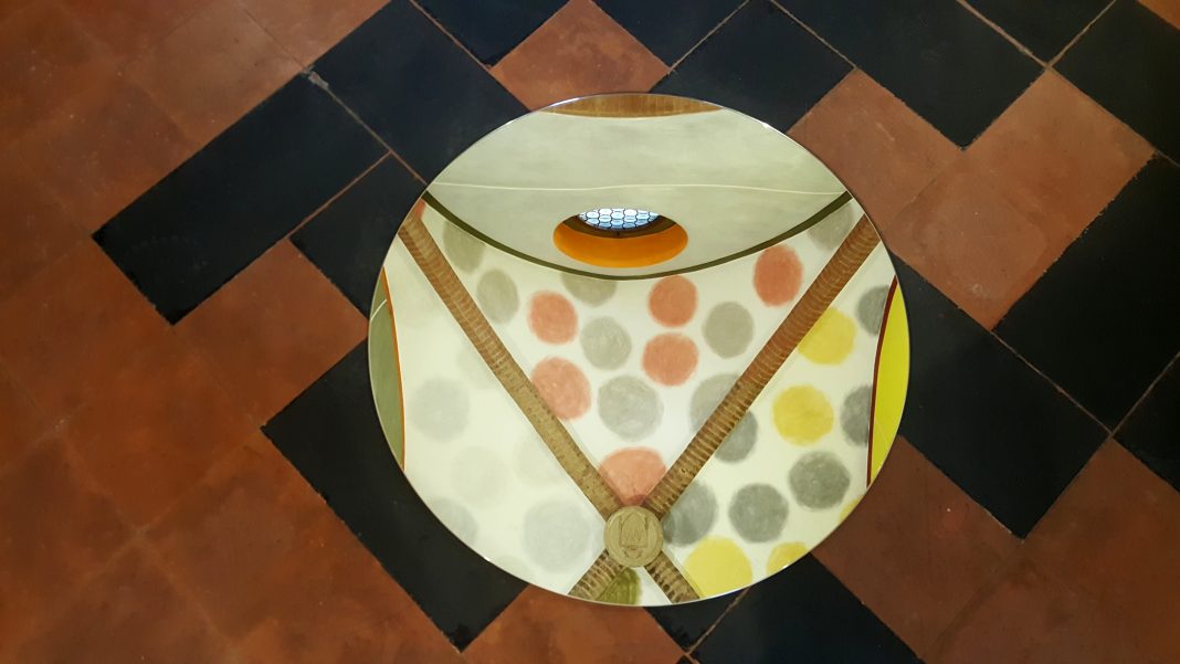 Tre specchi circolari creano una visione alternata tra cielo e terra, ribaltando la percezione dello spazio della cappella. L’artista dà forma a uno scambio strategico di riflessi e di luci, rendendo manifeste le molteplici direzioni che lo sguardo può assumere confondendo i dettagli e i naturali percorsi visivi.