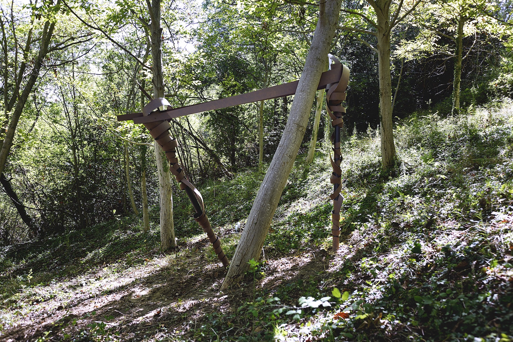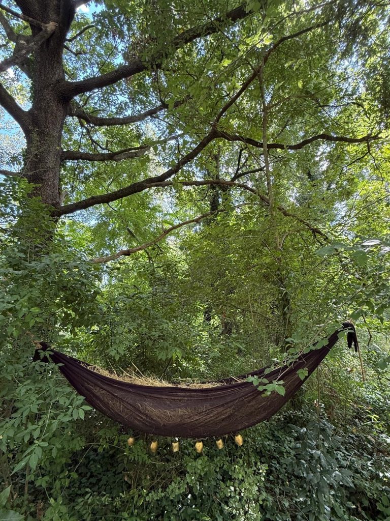 Questo perché ogni anno una nuova installazione si introduce nel folto noceto, nascosto nello sterminato terreno, e quest’anno è stata la volta di Bruna Esposito, Leone d’Oro alla Biennale di Venezia 1999, che ha arricchito “la terra di nessuno” con la sua installazione site specific dal titolo Oro Colato. La celebra amaca dell’artista è realizzata con un tessuto nero semitrasparente che accoglie al suo interno, come in un fagotto, del fieno. L’opera è poi corredata da piccole campane dall’origine sarda che, vibrando, risuonano nel bosco aggiungendosi alla ricca sinfonia e al concerto di voci che vi abitano. Le altre opere permanenti disseminate nel territorio portano la firma di Alvin Curran, Alberto Garutti, Donatella Spaziani, Jimmie Durham, Fabrice Hyber, Gülsün Karamustafa, Leonid Tishkov, Michelangelo Lupone con Licia Galizia.