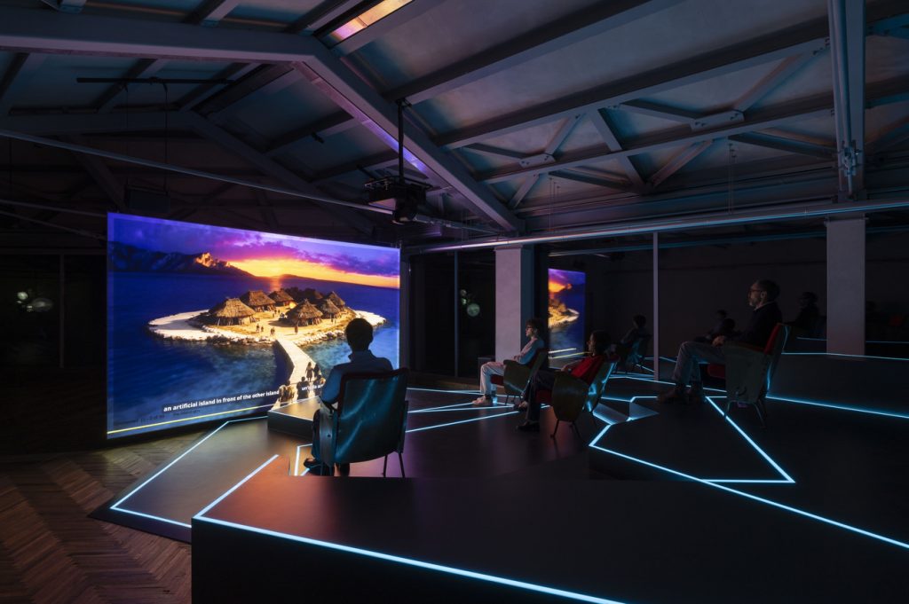 Hito Steyerl, The Island, 2025. Video HD monocanale, cinema; ologrammi con rumori quantistici; sfere con proiezioni archeologiche; video documentari. Durata 26 minuti (video HD monocanale); installazione di dimensioni variabili