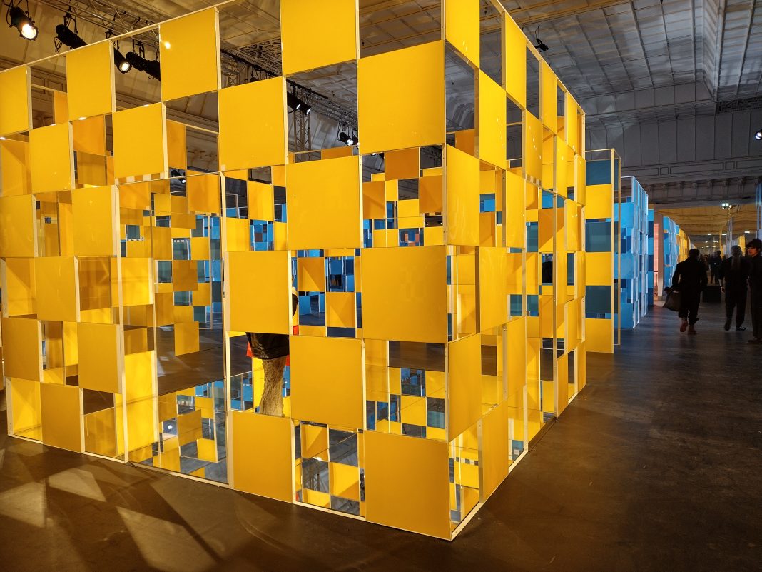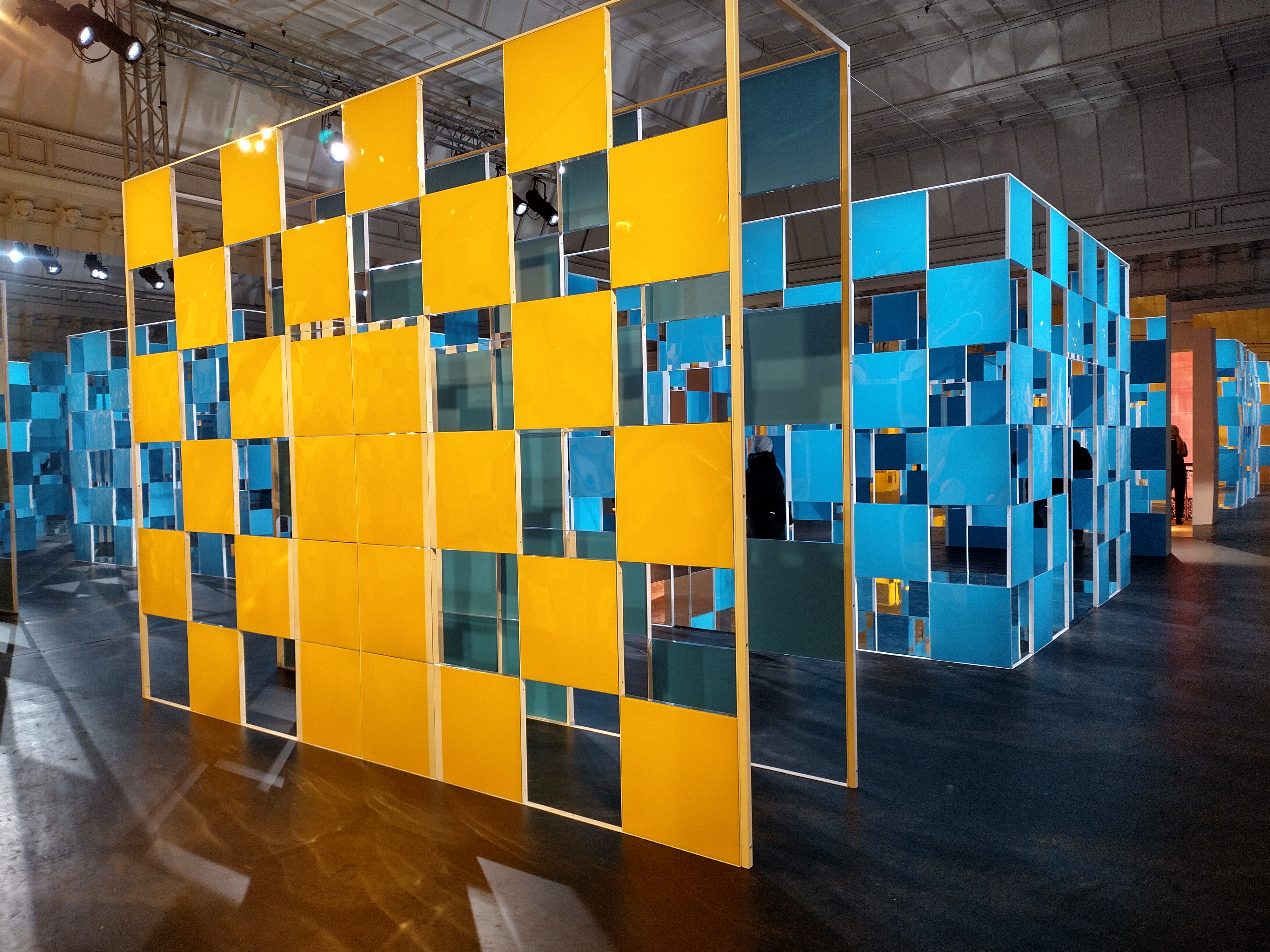 Al secondo piano, nella galleria espositiva, troviamo Le Cabanes éclatées in blu e giallo, per una passeggiata immersiva tra prospettive e giochi di specchi a mo’ di caleidoscopio. Ricordiamo che Le Cabanes éclatées sono delle creazioni in situ presenti nel lavoro dell’artista sin dal 1975. Inoltre, la ricerca di Buren è da sempre legato al concetto di opera in situ, che per lui deve interagire con il luogo che la ospita. Già nel 1968 l’artista stampa strisce di colori diversi per incollarle su pannelli che porta a spasso per le strade parigine a guisa di uomo sandwich. Le mitiche strisce, oggi marchio di fabbrica dell’artista, le troviamo in varie parti del mondo, come nello spazio pubblico del cortile d’onore del Palais Royal a Parigi.