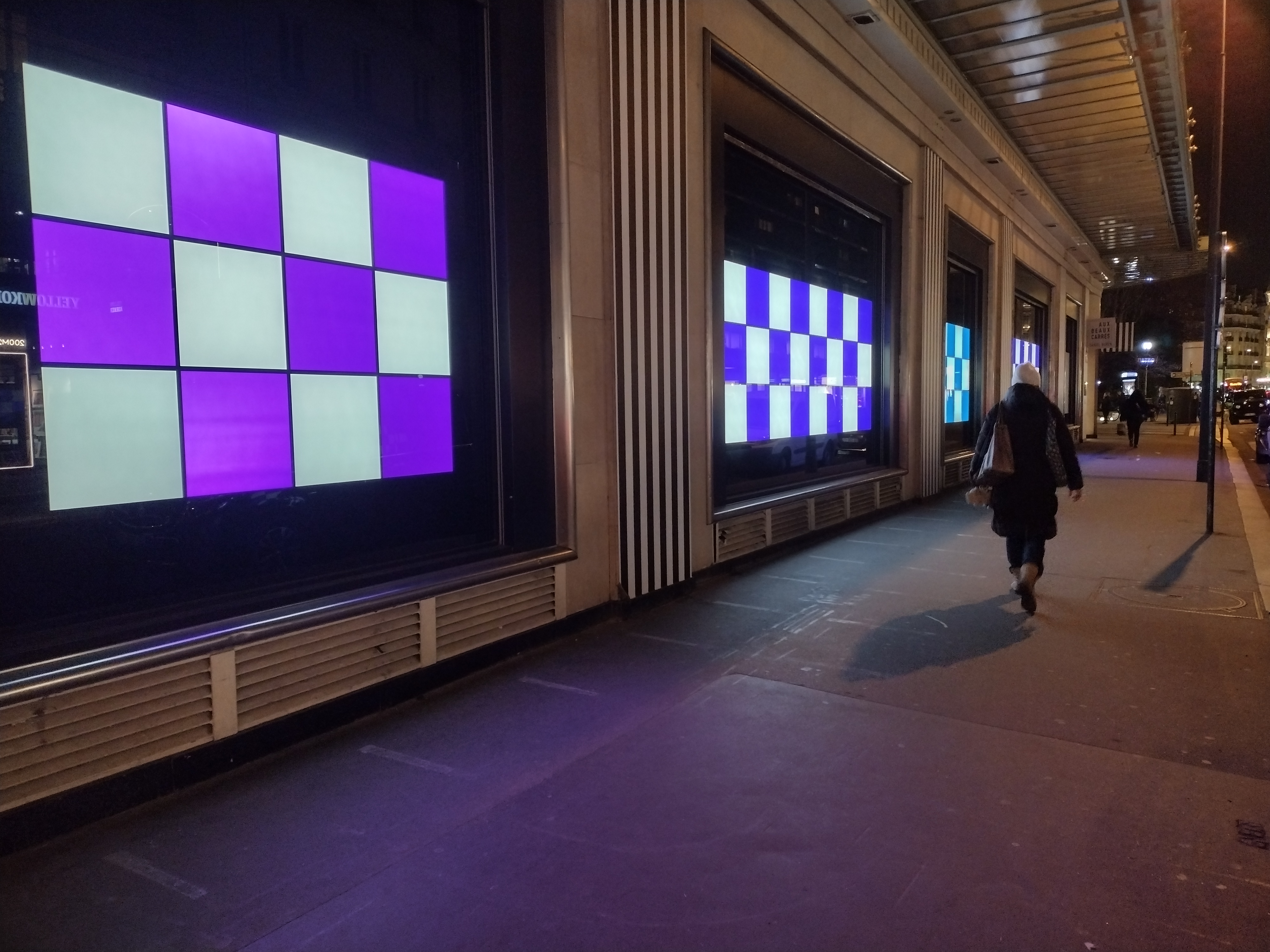 L’esposizione parte dall’atrio d’ingresso per dispiegarsi nello spazio espositivo del secondo piano e in alcune vetrine storiche della rue de Sèvres, fino al 18 febbraio 2024. In questo primo atto, Buren sublima lo spazio interno con opere monumentali. Al centro del grande magazzino, troviamo una cascata di tegole colorate e traslucide – ossia 756 quadrati in vinile rosa e altrettanti in bianco di 50 cm su 50 cm ciascuno – che scendono dal tetto centrale in vetro lungo dieci metri per restituire uno spettacolo leggero e ricco di sfumature. L’artista trasforma e mette in risalto la scala mobile centrale con le sue mitiche strisce verticali in bianco e nero di 8,7 cm, mentre una scacchiera colorata arricchisce le vetrine retroilluminate del grande magazzino.