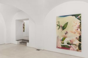 Sulle tele le combinazioni di colore, che emergono dai luminosi fondi bianchi, si strutturano in modo da evocare luoghi onirici ed irreali, come in Windless towards summer (2021) o Drip Drop Drip Drop (2021), dove le pennellate liquide di colori ad olio dalle sfumature pastello – rosa, verdi, gialli e rossi – si combinano con tratti di vernice spray, che ravvivano ulteriormente le superfici delle tele. Una struttura che sembra casuale, nel suo ricordare fondali marini, giardini tropicali o visioni lisergiche, dove ravvisiamo echi di maestri come Cy Twombly, Philip Guston o l’ultimo Monet, ma in realtà è sapientemente orchestrata dalla Silva .