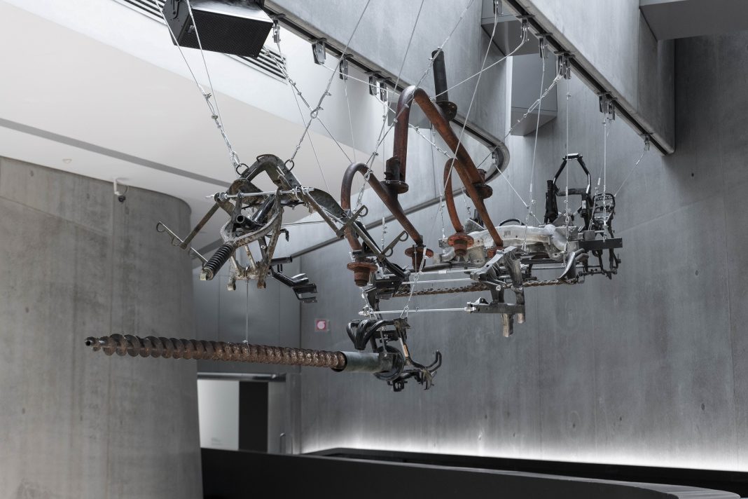 L’esposizione esordisce nella hall e si sviluppa lungo il percorso delle scale a forma di nastro di möbius con Lento-violento, l’istallazione monumentale di Giulia Cenci. Dal soffitto, pendono nuclei scultori tratti da calchi di volti, corpi di animali e oggetti di recupero: «la scelta di creare porzioni anziché elementi interi, riflette la precarietà del momento storico che tutti noi viviamo, in cui siamo costretti a limitare azioni, desideri e spostamenti. È come se fosse una vita a metà, non pienamente vissuta così come i calchi che ho realizzato. Ho lasciato che lo spazio del museo e le sue superfici in movimento mi aiutassero a concepire varie scene e momenti del mio lavoro. L’opera è stata sviluppata nel corso di dieci mesi e ha mutato la sua forma, assumendo nuove caratteristiche e vivendo anch’essa il lockdown» ha raccontato Giulia Cenci che ama lavorare sul confine-limite che intercorre tra mondo umano e animale, tra architettura e spazio urbano. Usa spesso elementi di metallo che tengono insieme le sue figure, sono interdipendenti l’uno dall’altro come se fossero linee guida e al tempo stesso estensioni dell’opera. L’intento ultimo è quello di mostrare il dietro le quinte di come il reale ci appare.