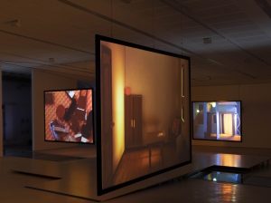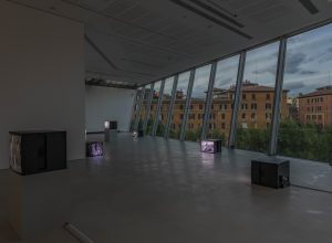 La scritta MAXXI BVLGARI PRIZE 2020 color viola fluo segna l’ingresso della galleria 5, da cui la mostra procede con A Week’s Notice di Tomaso De Luca: un film a tre canali e un’installazione sonora. Tre immensi schermi pendono dall’alto in uno spazio dalla superficie multiforme, ciò che mostrano sono case che volano, crollano e impazziscono. Elogiano il disfacimento dell’architettura, rappresentano la bellezza dell’instabilità e traghettano il trauma in un territorio di creazione. «Il mio lavoro è un tentativo di riscrittura del fenomeno della gentrificazione successivo alla crisi dell’AIDS tra gli anni ‘80 e ‘90, quando la comunità omosessuale scompariva dai quartieri delle grandi città e il mercato immobiliare viveva quella strage come un’opportunità di investimento. Lo scopo ultimo di A Week’s Notice è riscrivere un finale, dando una possibilità di bellezza a un trauma sociale e storico con la gioia di far rinascere queste case in un’architettura diversa che vola, si spezza e mal funziona». L’artista così racconta il senso del suo lavoro, terminato a fine febbraio 2020, poco prima che l’Italia e il mondo intero conoscessero un nuovo tipo di pandemia e la relazione intima con lo spazio domestico.