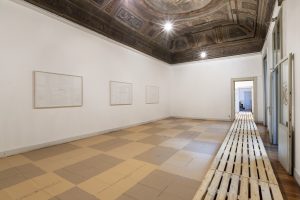 L’esperienza dello spazio. Ciò che Cartesio definiva “res extensa”, il fuori di noi. Il mondo a perdita d’occhio e il rapporto, mai scontato, tra il nostro sguardo e la distanza. Il panorama della mente. Il campo allargato. Il vuoto. La visione perspicua. Tutti questi elementi, nozioni e concetti, le differenti esperienze storiche e culturali e le rappresentazioni che ci determinano, ci definiscono dentro margini di significato, continuamente si spostano e variano con noi. Ma poi, a un certo punto, è necessario semplicemente fermarsi, e guardare. In questa mostra ad esempio è stato per me molto importante trovare un equilibrio tra l’orizzontalità estensiva dell’installazione a pavimento e la frontalità delle opere appese alle pareti. Un dialogo aperto tra due dimensioni che sono anche due modalità operative, due corpi differenti, ma in relazione. Il tratto d’unione è la lunga passerella che connette lo spazio della galleria e lo attraversa tutto come un binario, un ulteriore piano di composizione.
