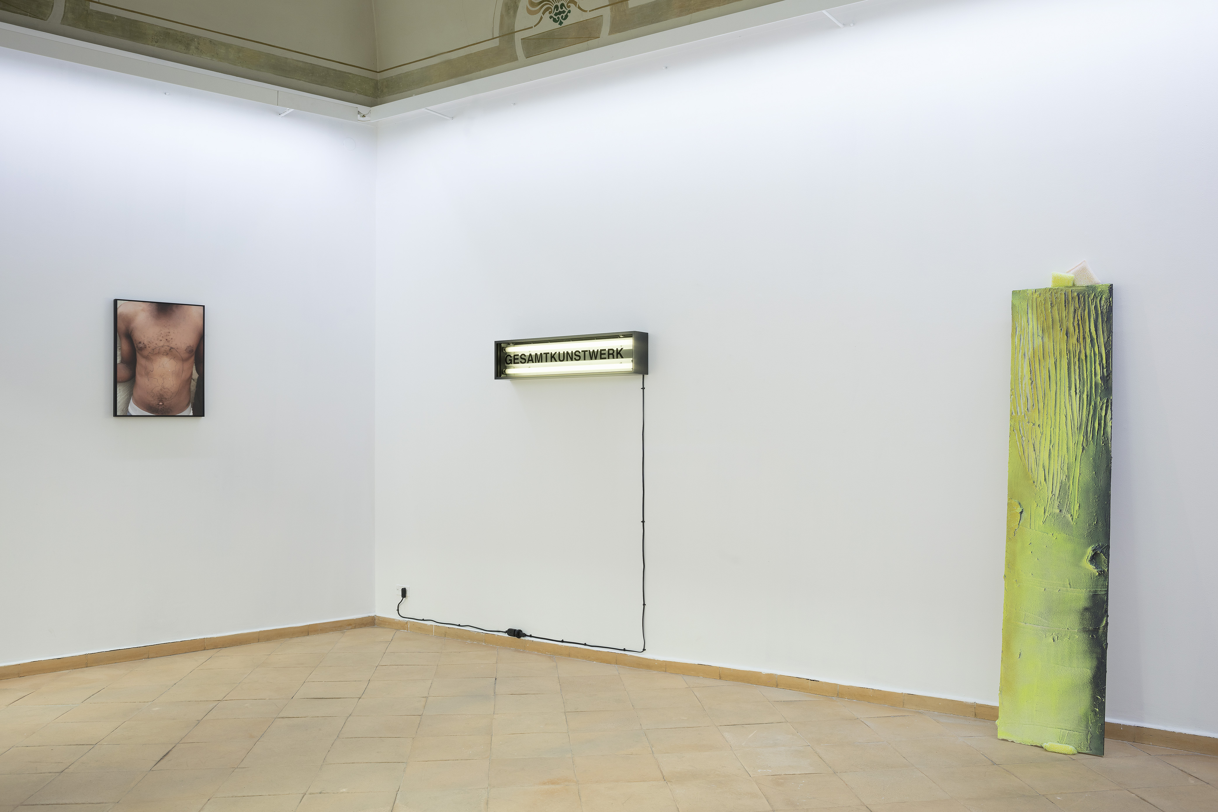 Ora sorprende l’ermetismo. Una TV proietta Vertical Take-Off di Zerek Kempf, in cui al percorso di un sole finto segue l’ascesa al cielo di un uomo. La terza stampa di Gwen Smith, January 5, 2018 (tattoo of the world/ the justice project) è un’immagine simbolica delle potenzialità comunicative dell’arte, mentre l’artista visiva Rachel Harrison modella una scultura totemica verde, Casabella. Il riuso creativo di materiali di scarto si erge ad antidoto del consumismo, anche artistico. Con Gesamtkunstwerk il cileno Alfredo Jaar crea una scatola luminosa in cui campeggia il termine tedesco. Per Wagner la massima espressione della Gesamtkunstwerk, in italiano “opera d’arte totale”, era l’arte teatrale greca, in cui convergevano musica, drammaturgia, poesia e arti figurative. Astraendo il concetto Jaar lo eleva ulteriormente.