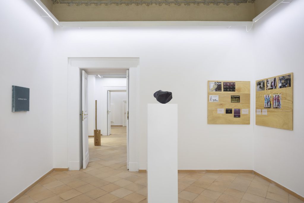 Nel terzo ambiente Eran Schaerf, israeliano stabile a Berlino, modella il linguaggio come una materia scultorea. Le tavole di compensato di The Lead #3 e The Lead #5 sono coperte da criptici stralci della vita umana. I lavori di Zerek Kempf e Agnieszka Kurant proiettano in un’atmosfera sospesa: The Dukes è una scultura in alluminio del dorso di un volatile con la testa immersa nel muro, Air Rights 6 una scultura di pietra in polvere che, sospesa tramite elettromagneti, testimonia un’assurda precarietà. La bellezza dell’arte non immediata si eleva nelle Lachrimae Antiquae XII–XIV di Susan Philipsz. Una singola lacrima che cade, il suono che produce e l’emozione che l’ha scaturita sono qui immortalate con il sale su tela.