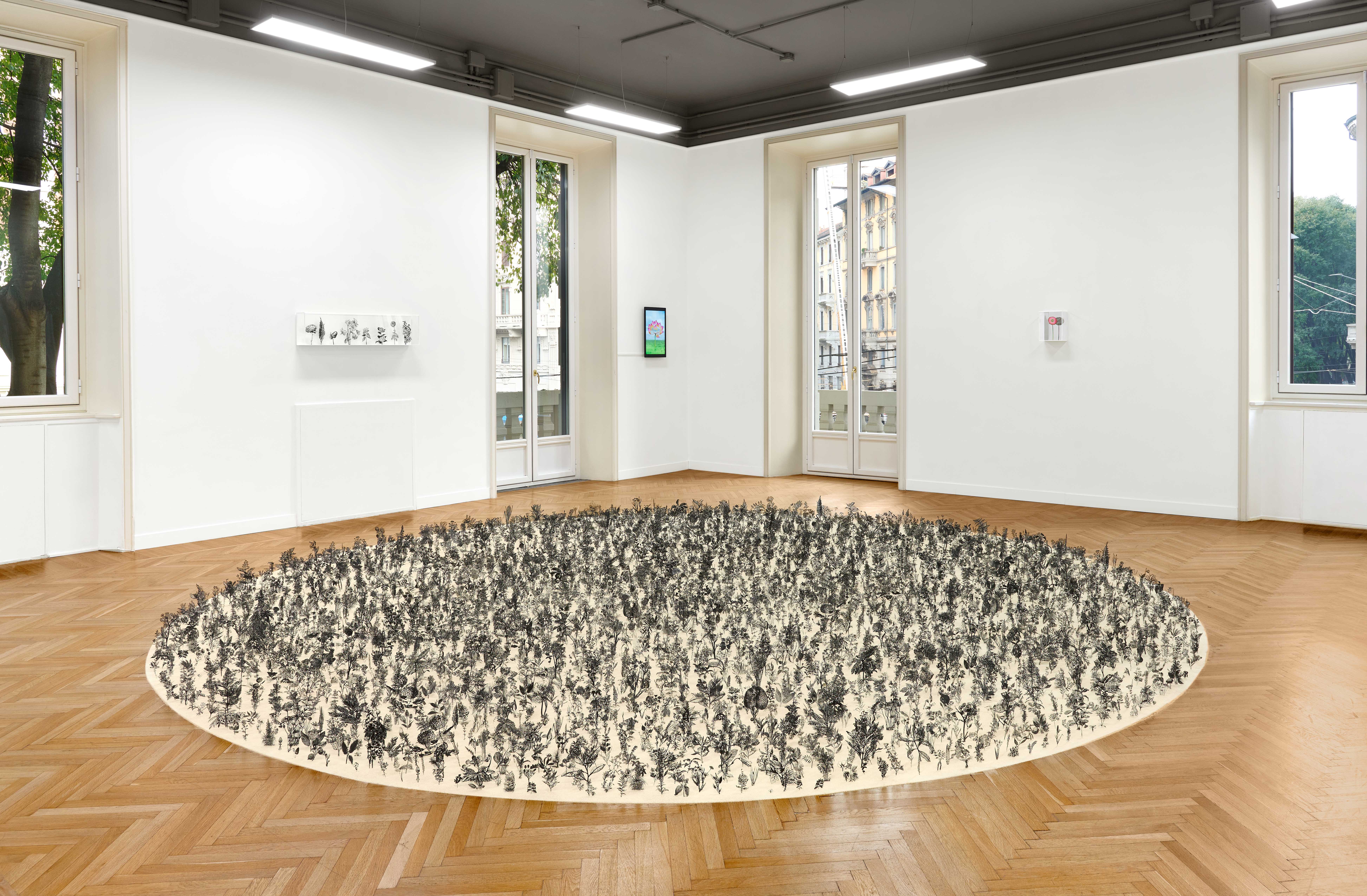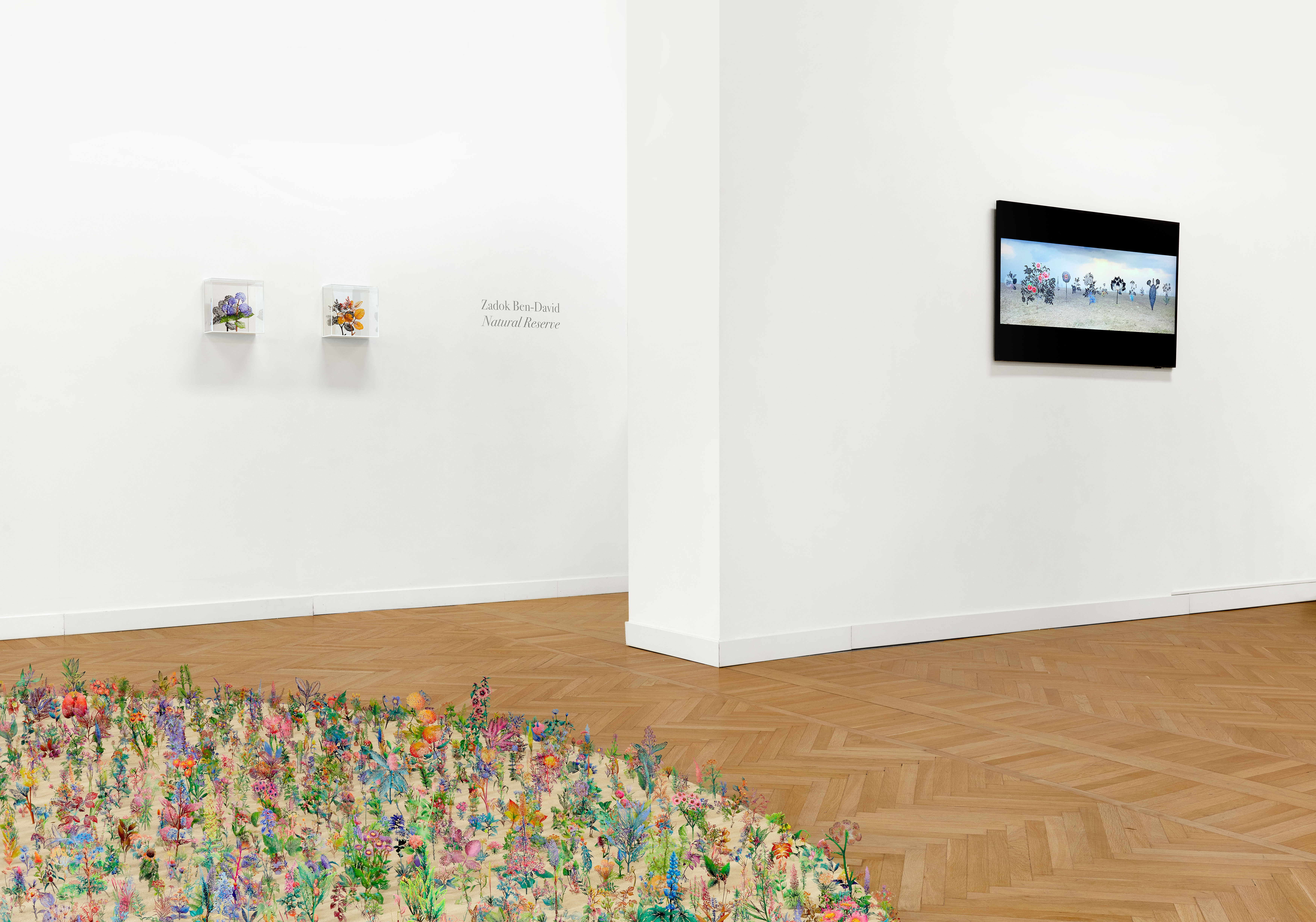 Sono seimila le differenti specie di piante germogliate dal pavimento della Nashira Gallery in occasione di Natural Reserve, la personale di Zadok Ben-David (fino al 26 gennaio 2024). A primo impatto il colore nero, con il quale sono state dipinte, porta a un senso di smarrimento, legato all’associazione con un’idea di decadimento e morte imminente. Ma girando attorno al cerchio dal diametro di ben cinque metri, dal quale sembrano essere realmente nate, rivelano anche tonalità variopinte. Questo gioco contrastante tra nuance accese e scure rappresenta «due situazioni estreme: la vita e la morte. Tuttavia si tratta di una scelta più che di un destino. I fiori sono intesi come una metafora, un simbolo di due stati emotivi estremi – felicità e dolore», ha affermato l’artista. È il tema di Natural Reserve, che conduce il pubblico a riflettere sulle conseguenze dell’agire umano.