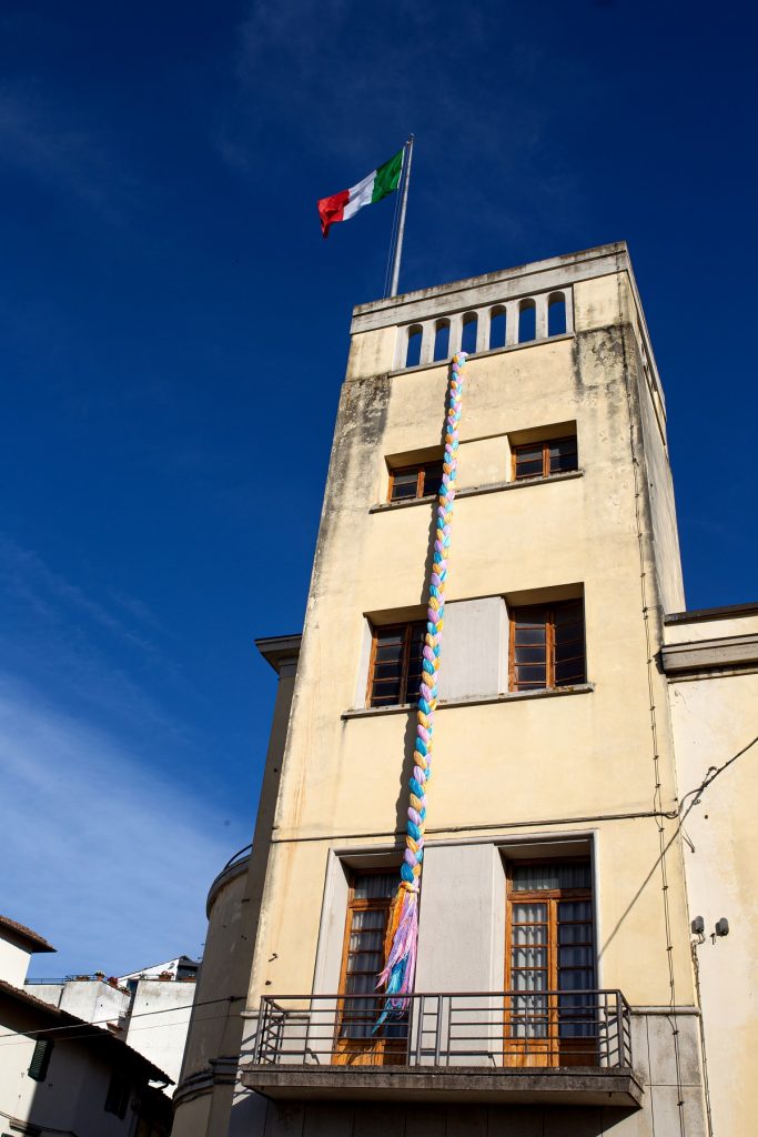 Dalla Torre del Niccolini, Matteo Nasini ha fatto scendere una lunga treccia costituita da 250 chilometri di fili che, nei giorni precedenti all’inaugurazione, sono stati intrecciati in loco con la collaborazione della popolazione. La treccia, che misura 18 metri, è costituita da fili di lana sintetica coloratissimi, come un elemento fantastico che rimanda al mondo delle fiabe. La stretta connessione che si è sempre avuta tra lavoro manuale e mondo fantastico è dato dal fatto che, anticamente, spesso le fiabe venivano narrate mentre si compivano lavori dati da gesti sapienti e meccanici. In Toscana, in particolare, si usava raccontare mentre le donne ricamavano, intrecciavano la paglia o facevano altre attività del genere. La treccia diventa dunque il mezzo di collegamento tra quotidianità e fantasia e diventa il segnale che sollecita a porre l’attenzione su un luogo simbolo della cultura di San Casciano.