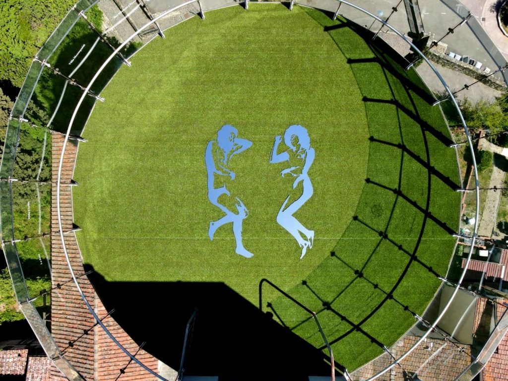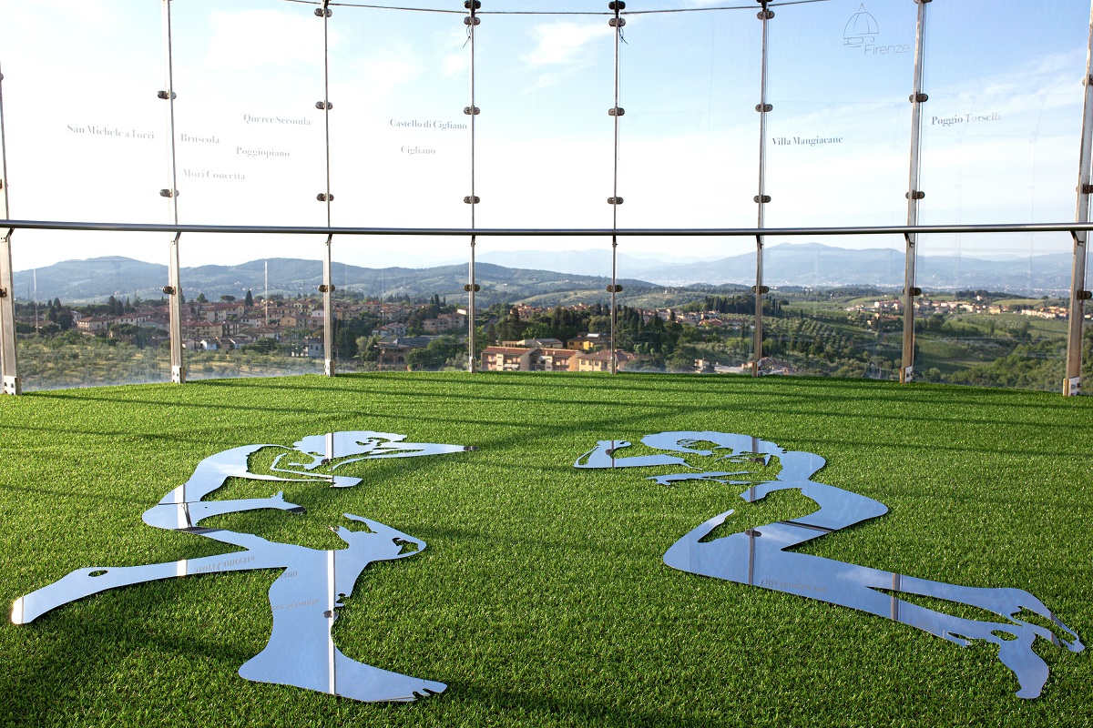 L’altra torre, forse la più spettacolare, la Torre del Chianti, è stata prescelta da Simone Gori per la sua opera. Si tratta di una costruzione degli anni ’50, alta 33 metri, che serviva per il recupero dell’acqua piovana, successivamente divenuta, grazie all’installazione di un ascensore, un luogo privilegiato per spaziare attraverso a un panorama mozzafiato. Somnium mundi è concepito come un percorso esperienziale che attraverso il percorso ascensionale che dalla terra porta verso il cielo. Entrando alla base della torre, prima di accedere all’ascensore, il fruitore viene catapultato in un mondo misterioso con suoni cosmici stranianti. Nell’ascensore a vetri che permette di percepire un’‘ascensione’ vera e propria si legge la frase di Ennio Flaiano: «Sognatore è un uomo con i piedi fortemente appoggiati sulle nuvole». Una volta raggiunta la vetta ci si trova su una piattaforma con un prato verde su cui due sagome in acciaio specchiante, un uomo e una donna, sono coricati. Sono due sognatori, allegoria dell’uomo e dell’elevazione del pensiero umano, che ci aiutano a percepire il paesaggio da un’altra dimensione. Siamo così nel mondo dell’immaginario dove tuto è possibile.