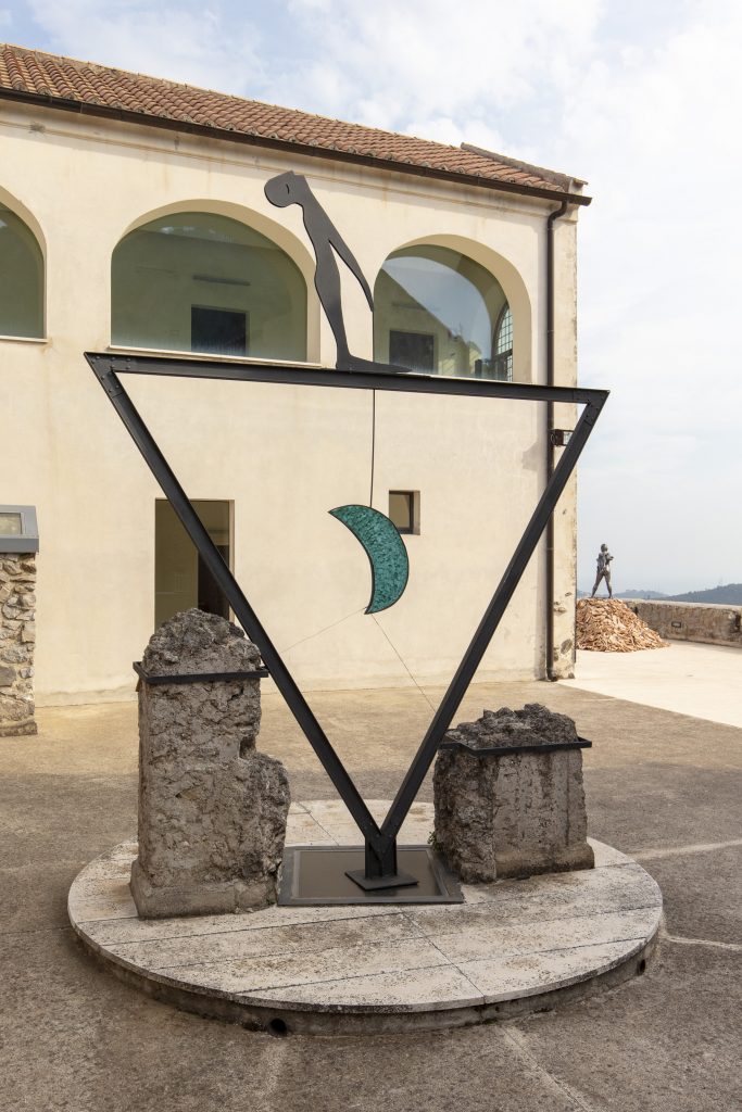Cristian Leperino, invece, pone su un mucchio di cocci, citando esplicitamente il “pavimento sonoro” di Ugo Marano, un Eros dilaniato dalle vicende della storia, con segni visibili della memoria, e lo innesta irto su di essi con lo sguardo che si disperde sull’ampio futuro. Infine, Ivano Troisi coinvolge gli elementi in un colloquio intimo con il genius loci, esortando i riverberi della luce e le vibrazioni dell’acqua a discorrere, sollecitate ad ogni nostro passaggio.