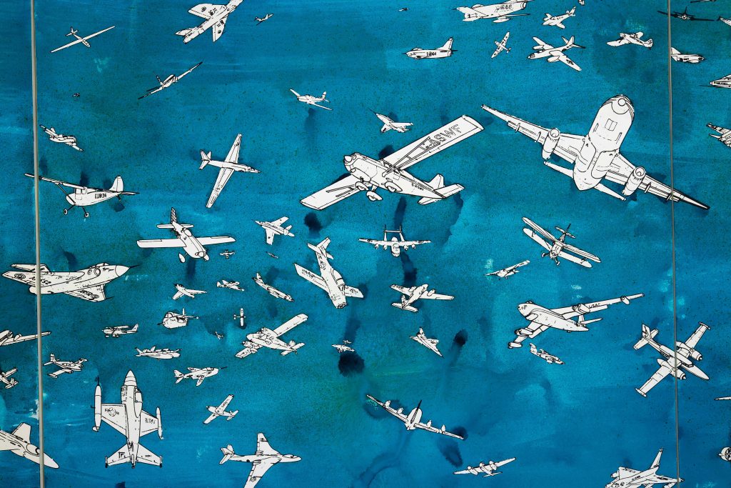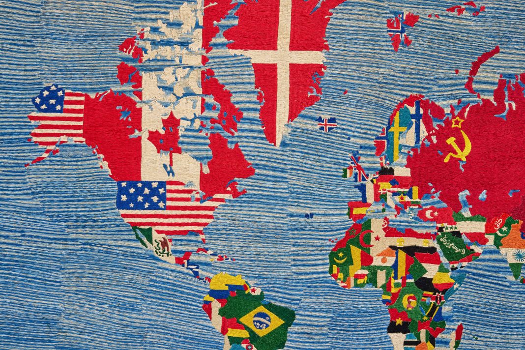 Questi grandi ricami rappresentano il planisfero politico del mondo, ogni nazione è riempita con la propria bandiera. Ma il dato geografico è tutt’altro che neutro: cambia nel tempo, segue le trasformazioni geopolitiche, registra guerre, dissoluzioni, nuove identità statali. Ogni mappa è quindi un documento storico e diacronico, oltre che un’immagine.