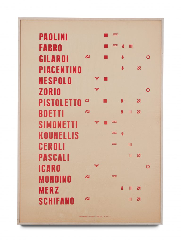 Alighiero Boetti, nato a Torino, nel 1940, entra sulla scena artistica alla fine degli anni Sessanta, in dialogo con il contesto dell’Arte Povera. Data importantissima per questo suo incedere nel mondo dell’arte è senza dubbio il 1967, quando la Galleria Christian Stein di Torino gli dedica la sua prima personale. Ma non solo: in questo stesso anno Boetti espone una sua opera in una mostra collettiva curata da Germano Celant alla Galleria La Bertesca di Genova. Forse il giovane Boetti non lo sapeva ancora ma quel momento lo avrebbe proiettato in tutti i manuali di storia dell’arte: è l’inizio dell’Arte Povera.