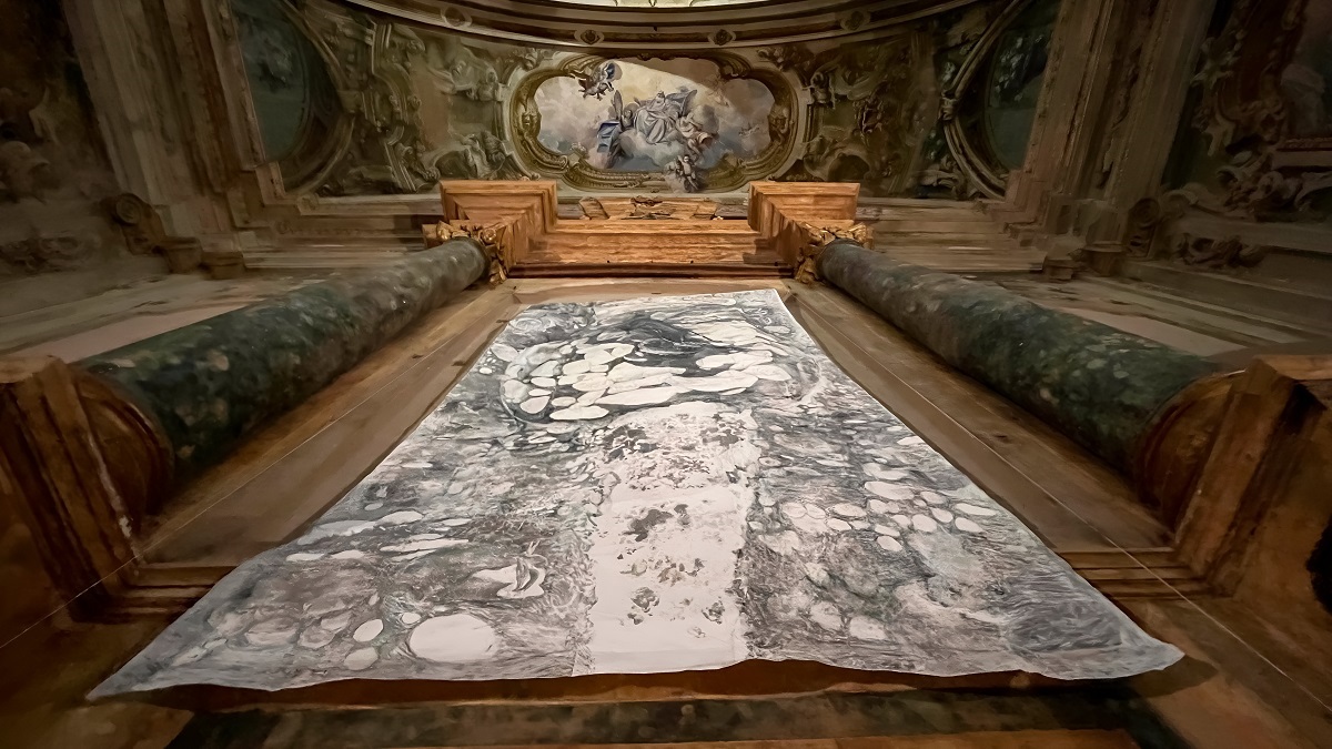 «Vi è sotteso il funesto momento contemporaneo appena vissuto, che ha certamente irrorato di memento mori tutti i lavori esposti. Mi sono tremati i polsi quando il curatore ha deciso di porre “Il Re del Mondo” sull’altare centrale; i cimiteri sono pieni di artisti che hanno sfidato ciò che non andava toccato. Così, per premunirmi, prima di collocare i quattro metri di disegno del “Re del Mondo”, un lucido bulldog scuro come Ahriman-Lucifero, mi sono premurata di disegnare sul suo retro l’angelo Michele che con la spada punge le terga del demonio. Il pubblico non lo vede ma c’è».