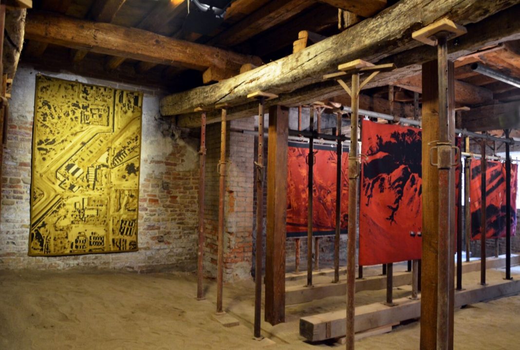 Più incisivo, per chi scrive, il lavoro di Ciriaco Campus. Visivamente molto efficace, e semanticamente perfetto, per il luogo e per ciò che ci racconta. L’artista porta infatti in questo spazio, che a terra ha della sabbia, residuo di una mostra precedente ma perfetta anche per questo occasione, degli arazzi, in cui vengono poste in risalto delle basi militari, come fossero piantine prese da satelliti. La basi in realtà ad occhio nudo non si vedono, e gli arazzi sono appesi come fossero lenzuola da asciugare. Ecco che dunque la grammatica della narrazione diventa evidente quando si scopre la tragicità che va oltre l’estetica, che ad ogni modo è molto forte e coinvolgente. Ed è spiazzante ma allo stesso tempo emozionante per lo spettatore trovarsi a camminare attraverso queste grandi tele appese, sistemate una vicina l’altra, una dopo l’altra, a narrare una vita segreta di cui pochi di noi conoscono realmente le coordinate.