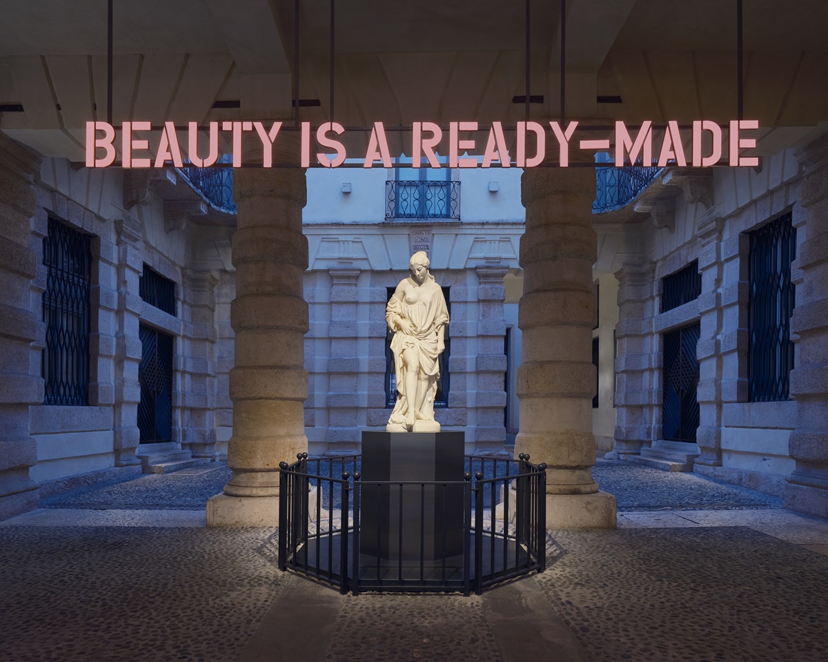 Claire Fontaine (Collettivo - Parigi, 2004) Beauty is a ready made, 2024. Lettere a LED tridimensionali, struttura e supporto / Alessandro Puttinati, La Bagnante, 1846 Marmo di Carrara, Verona, Palazzo Maffei Casa Museo. Ph Andrea Pugiotto