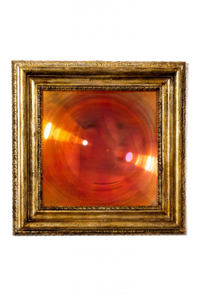 Valerio D’Angelo, Collateral Display, lens, 2025, pellicola dicroica su vetro e cornice seicentesca, cm 44 x 44, ph. Paolo Amadei