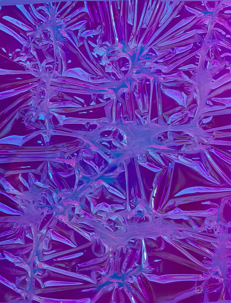 Valerio D’Angelo, classe 1993, ha trasformato lo spazio in un laboratorio sensoriale e concettuale, proponendo una collezione che vede come protagonista la materia e la luce. Per la materia utilizza una pellicola dicroica con cui riveste pannelli di plexiglass e specchi, ottenendo opere dalle cromie cangianti, in continua mutazione. Il colore cambia a seconda di come e dove la si guarda.