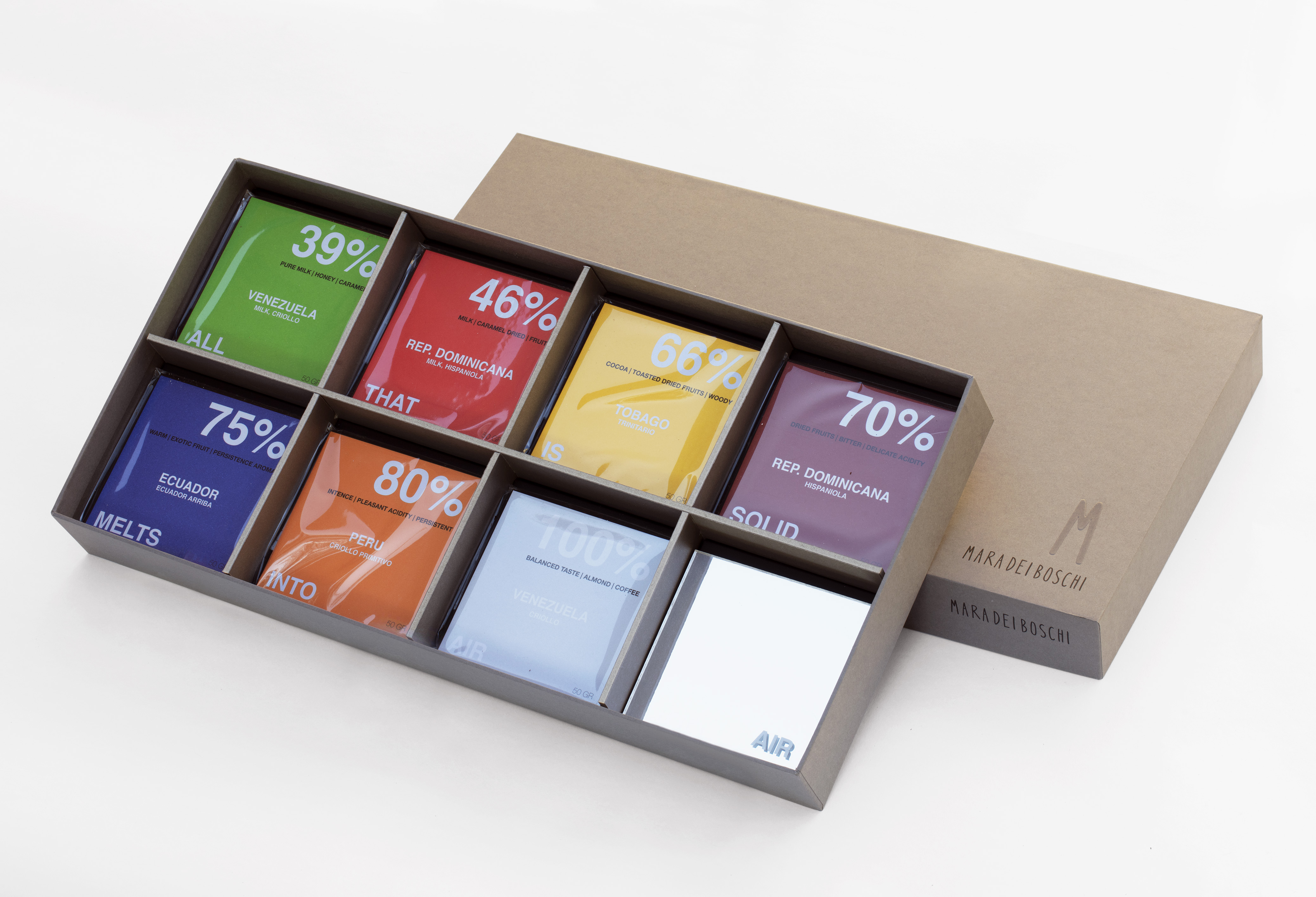 «Abbiamo proseguito con l’artista candese Dana Wyse. L’ho conosciuta perché vendeva ad Art Basel, a Basilea, delle confezioni di “pillole” che in modo miracoloso promettevano cura per ogni cosa. Insieme abbiamo scelto otto “cure” da tradurre in praline. Tra queste la pralina grigia per capire le cose, composta da due nocciole immerse nel gianduia che come due neuroni che si toccano e creano una sinapsi, oppure quella rosa per capire l’arte contemporanea, composta da caramello alla soia e sesamo, sorprendente e spiazzante come dovrebbe essere l’arte. Poi, con Henrik Plenge Jakobsen, siamo partiti da una sua mostra intitolata Das Kapital. All’interno della mostra era esposta una macchina volkswagen e una serie di sette pannelli coloratissimi che riportavano la citazione dal Manifesto comunista “All that is solid melts into air”. Questa frase, che mi piace da pazzi, mi fa pensare al cioccolato. Così come i sette pannelli della mostra, abbiamo realizzato una scatola composta da tavolette di cioccolato riprendendo i medesimi colori».