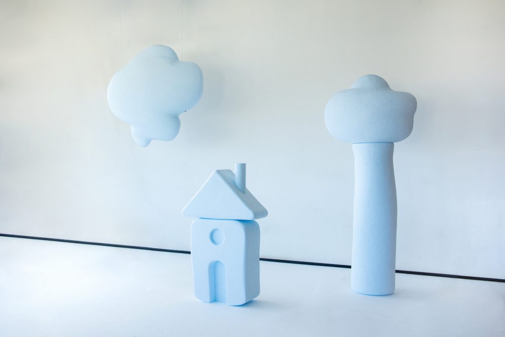 «Nella mia pratica molti lavori prendono forma dal dialogo con i materiali e il loro potenziale narrativo. Sonia Belfiore, ideatrice del programma di residenze in azienda Ultravioletto, a conoscenza della mia storica passione per il polistirolo, mi ha proposto di collaborare con l’azienda Tecnodinamica srl. Per quest’occasione sono partita dall’emozione scaturita dal materiale stesso così che diventasse parte del soggetto e non solo il medium. Il polistirene con la sua tipica colorazione candida ha ispirato un paesaggio per me intimo e onirico, rintracciabile nelle rappresentazioni di quei ‘luoghi sicuri’ che troviamo nei disegni dei bambini riportanti alcune forme simboliche e famigliari. La progettazione delle sculture è nata in dialogo con i tecnici e con le macchine di lavorazione dell’azienda ed è stata poi ultimata da me a mano».