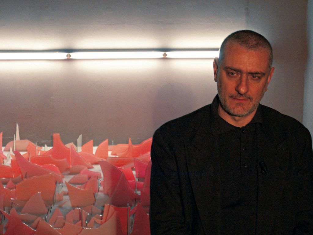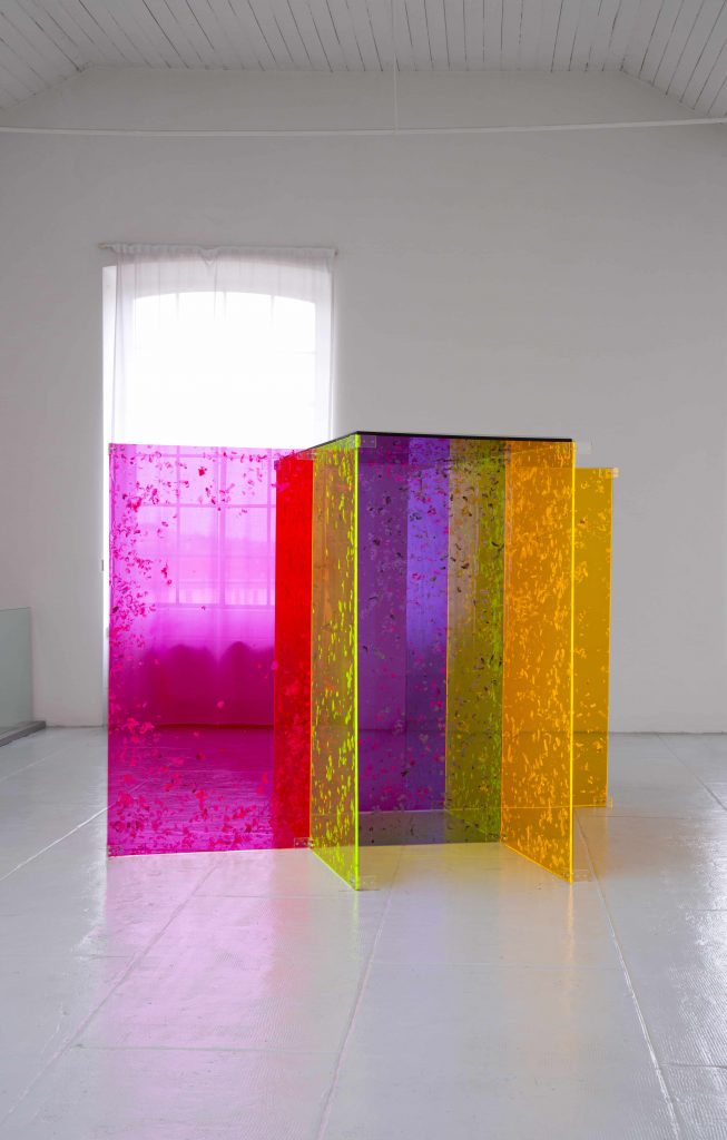‹‹Lo dicevo prima, l’opera consiste in un’architettura trasparente e luminosa composta di telai metallici in parte occlusi da pareti in plexiglas colorato artigianalmente che contengono piume reali. Uno spazio aperto e chiuso insieme che si attraverserà sia in orizzontale sia in verticale ma non per questo si deve pensare a un labirinto, l’orientamento sarà sempre evidente.