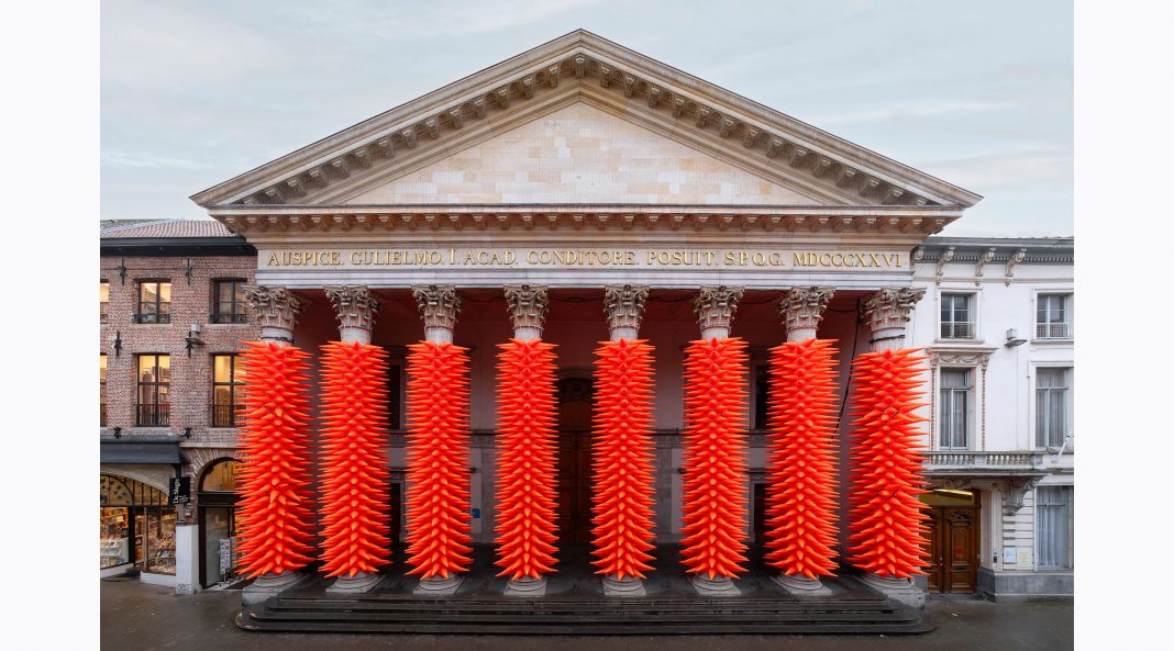 Meraviglia degli oggetti quotidiani più impensabili: come può un umile conetto stradale diventare un’opera d’arte? Chiedere a SpY che, perla sua ultima, spettacolare installazione, ha trasformato la facciata neoclassica dell’Aula Academica dell’Università di Gand, in Belgio, in un fittissimo bosco di spine arancioni riflettenti, che un po’ ripulsa e un po’ attrae.