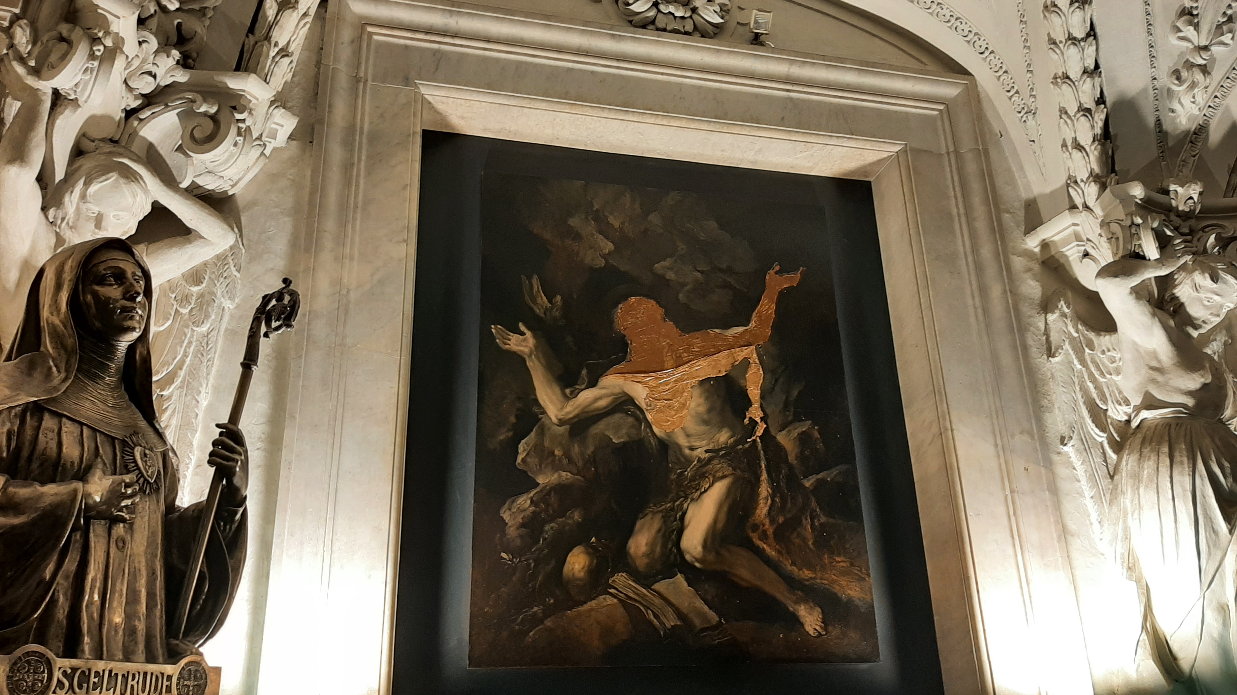 La gestualità, enfatizzata dai tocchi di luce caravaggesca sull’anatomia del corpo, allude al destino agiografico dei due eremiti che, come San Gennaro, sono stati metaforicamente privati della testa e quindi decollati scenicamente dall’artista. Il movimento che ogni anno simbolicamente sodalizza il legame tra il santo e il suo popolo è qui rappresentato dallo strascico del sangue color rame che emula quella della pelle umana in pittura, come la sua stessa sedimentazione.