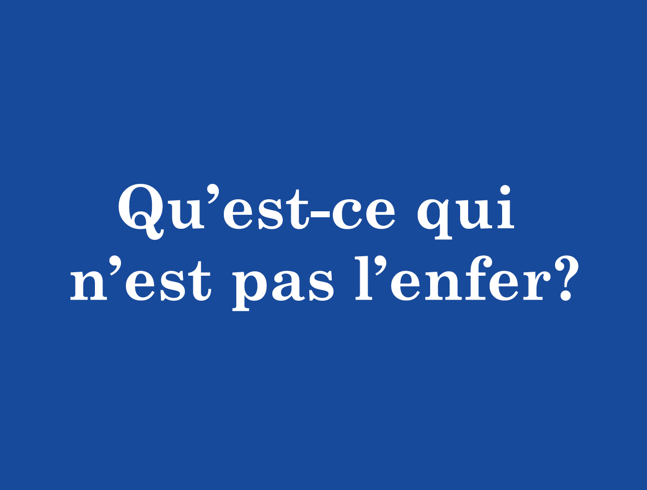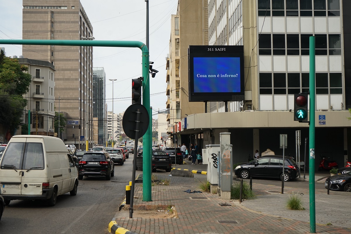 Cosa non è inferno? Si legge in arabo, inglese, francese e italiano, su una serie di cartelloni pubblicitari, eretti tra i grattacieli di Beirut. È la stessa città, come contesto metropolitano denso di stratificazioni culturali e storiche, ad ampliare l’eco della domanda, che suona come un’espressione senza tempo ma che, nella cronaca più attuale, assume una risonanza ancora più urgente e drammatica. Nelle Città invisibili, il protagonista Marco Polo conversa con l’imperatore Kublai Khan, mentre i confini tra l’inferno e il quotidiano si confondono. Ed è questa la sfumatura suggerita dalle domande impresse sui cartelloni e intercalate, come una parentesi, in un coro di voci e suoni metropolitani, tra automobili, muezzin e campane.