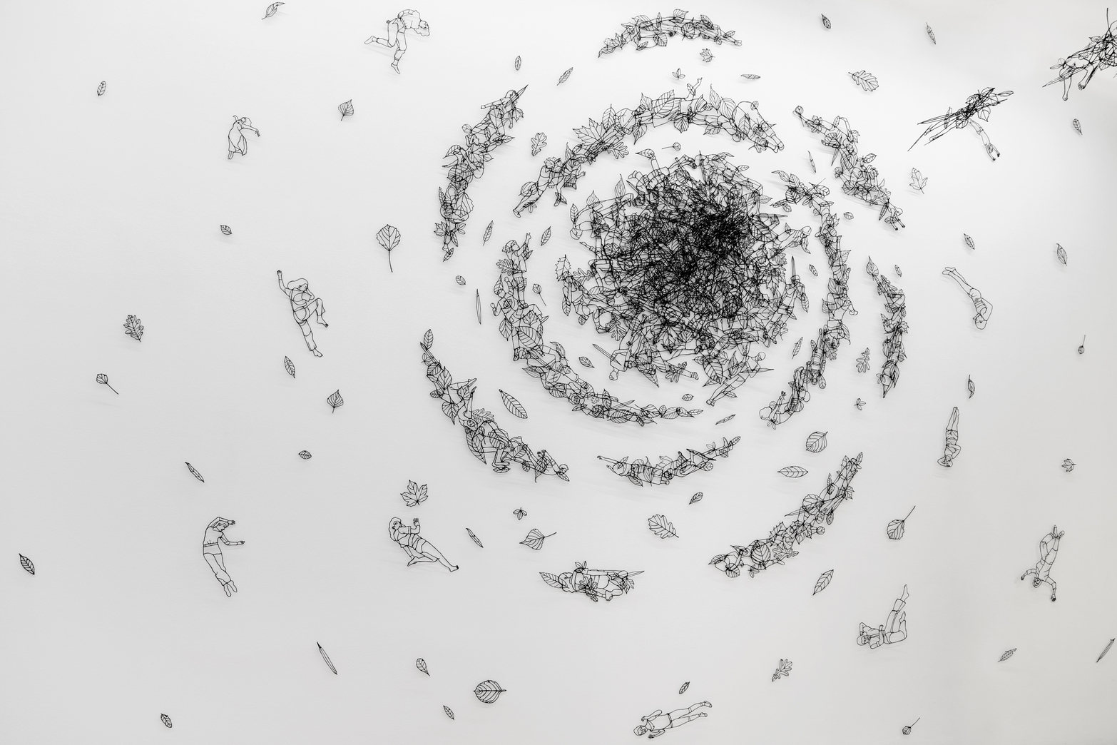 Le opere creano un nuovo ambiente in cui si plasma un universo circolare, famelico, colmo di segni e figure. Ma questo universo è anche una parete di funghi, un corpo di donna sepolto dalle foglie, un cosmo angolare con creature ai margini e segni volanti. Attraverso disegni leggeri, realizzati con una penna 3D e un filamento organico, l’artista descrive il suo mondo – il nostro mondo – con tratti sottili, segni che si fanno scultura.