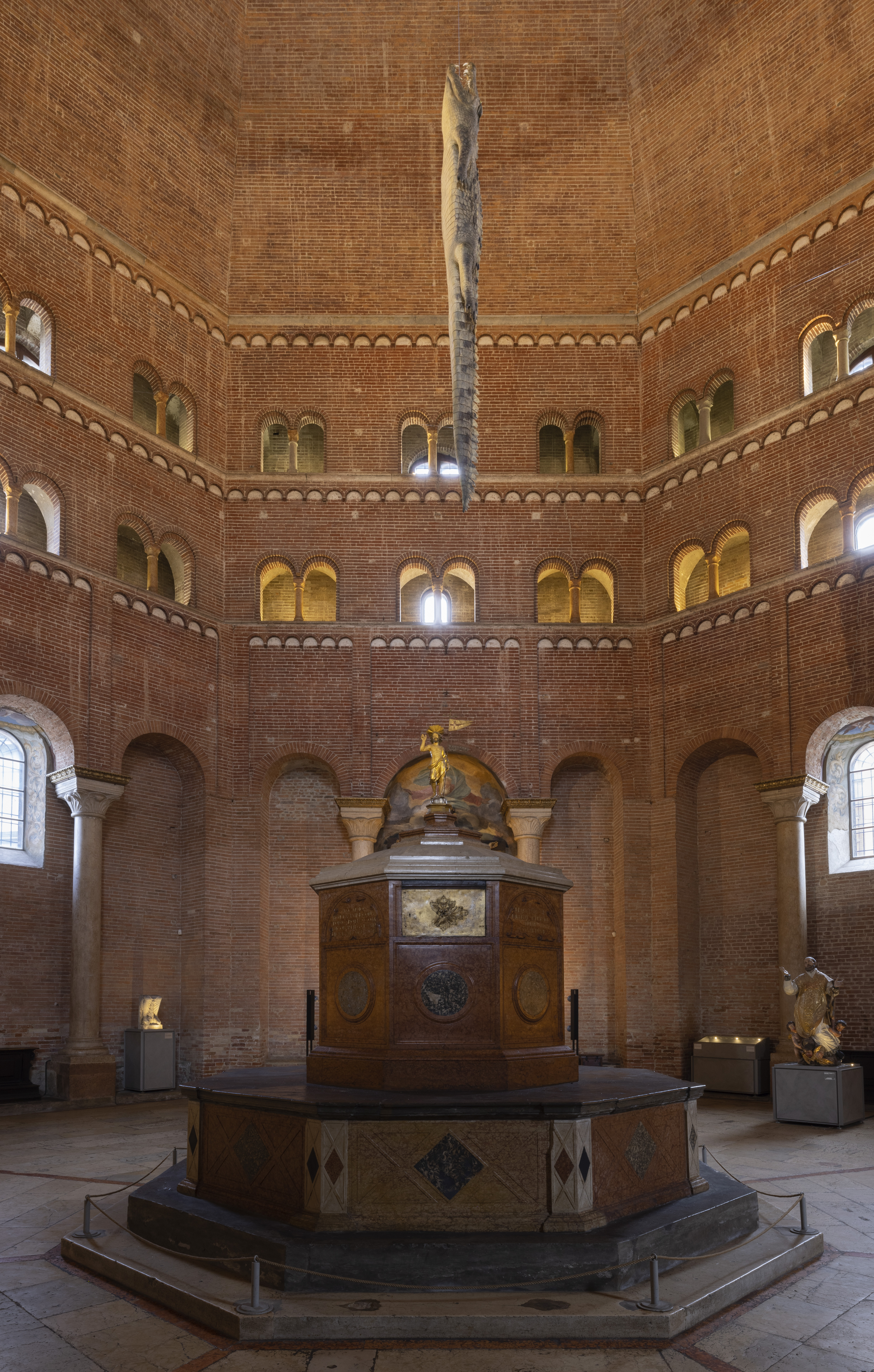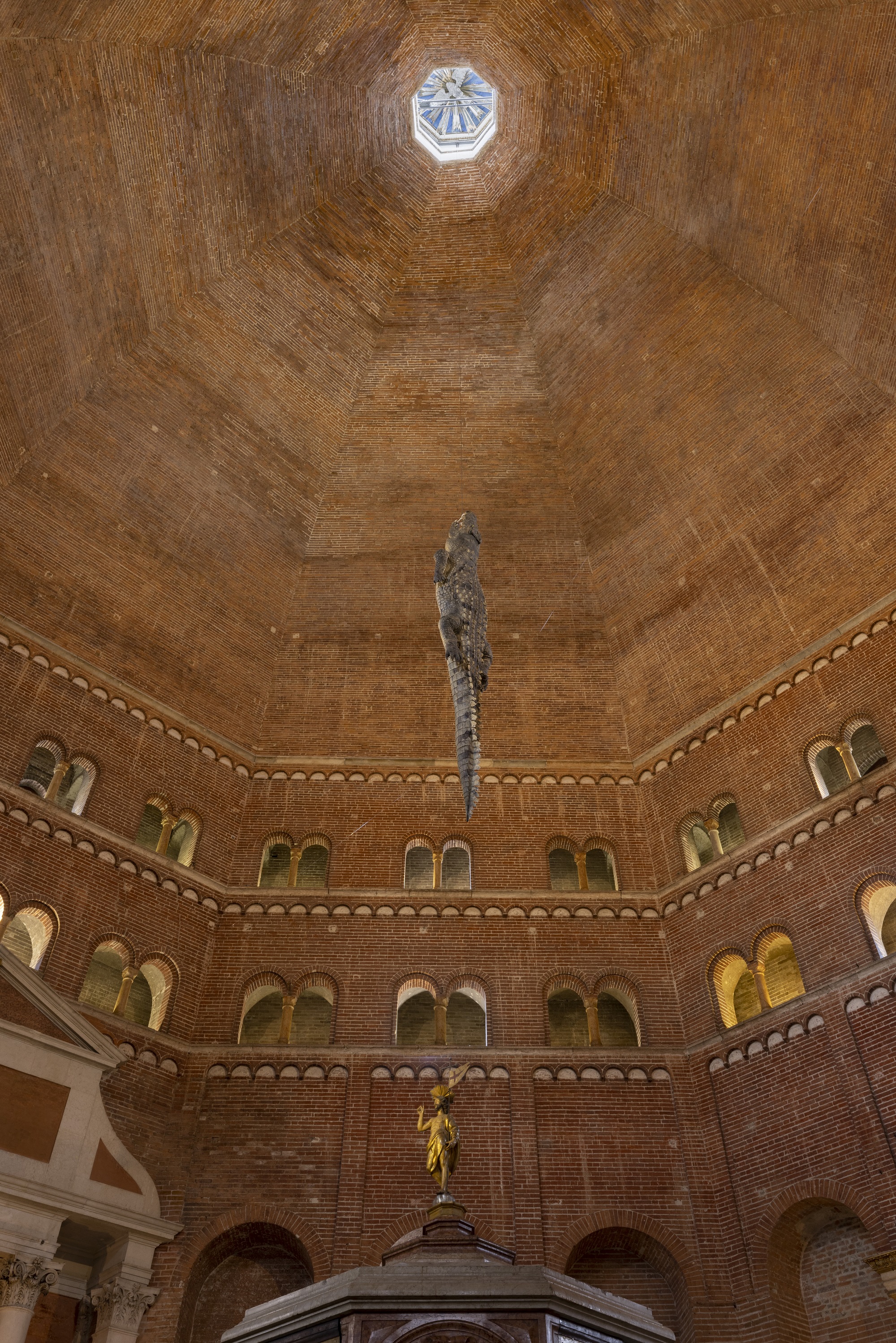 Partendo dal cuore della città, l’antico Palazzo Comunale ospita i lavori di Linda Carrara, Ettore Favini e Alessandro Agudio, che evidenziano una forte relazione tra paesaggio interno e paesaggio esterno e raccontano non solo l’origine agricola del territorio, ma anche il fiume Po con i suoi affluenti: un modo per rimarcare l’importanza di interrogarsi sul destino dell’ambiente. Maurizio Cattelan, tra gli artisti più internazionali e più attesi di Cremona Art Week, non manca di stupire con l’imponente installazione di un grande coccodrillo appeso sopra la cinquecentesca fonte battesimale del battistero: un rimando a complesse simbologie al confine tra sacro e profano dall’effetto straniante. Passeggiando per la città è impossibile non imbattersi nell’anima multidisciplinare e non cogliere la volontà di far “vivere” e “rivivere” in modo nuovo e sinergico spazi espositivi pubblici e privati, piazze e vie.