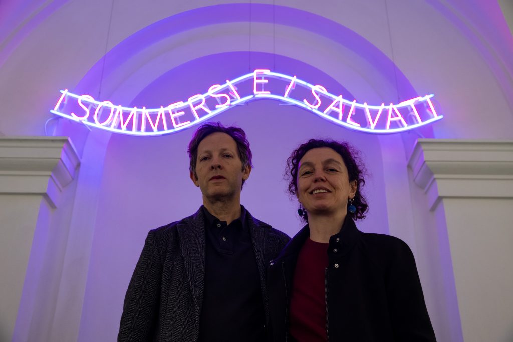 Tra le aule dell’università, sopra il busto di D’Annunzio e di fianco agli affreschi dell’Aula Magna in cui sono le donne a portare in mano le teste pensanti degli uomini, i salvati, il neon del duo italo-britannico squarcia il tempo e configura attuali letture del luogo in cui si inserisce, aprendo vedute crude e reali sui volti dei nuovi sommersi. Ciò che produce il progetto Crossing Border, Popoli in Movimento è una più contemporanea identità del museo, vicina alle persone, ma soprattutto vicina alle criticità del proprio tempo, raccontando non soltanto degli spostamenti spaziali, bensì di quelli attraverso il tempo in cui si registrano ritorni e sparizioni di ciò che da sempre riguarda l’umanità.
