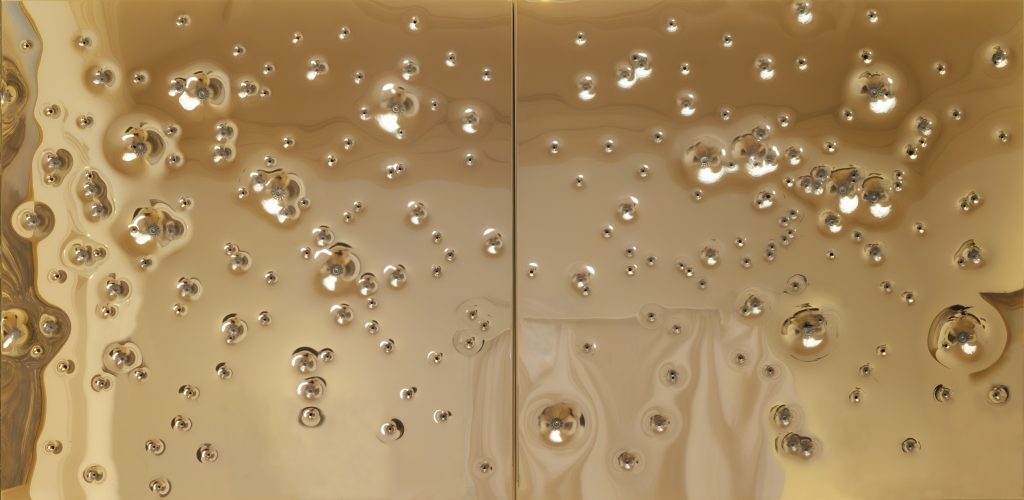 Maurizio Cattelan, Sunday. 2024. Due pannelli di acciaio dorato 24 carati sparato con differenti calibri, cm 135,6×135,6×3,8