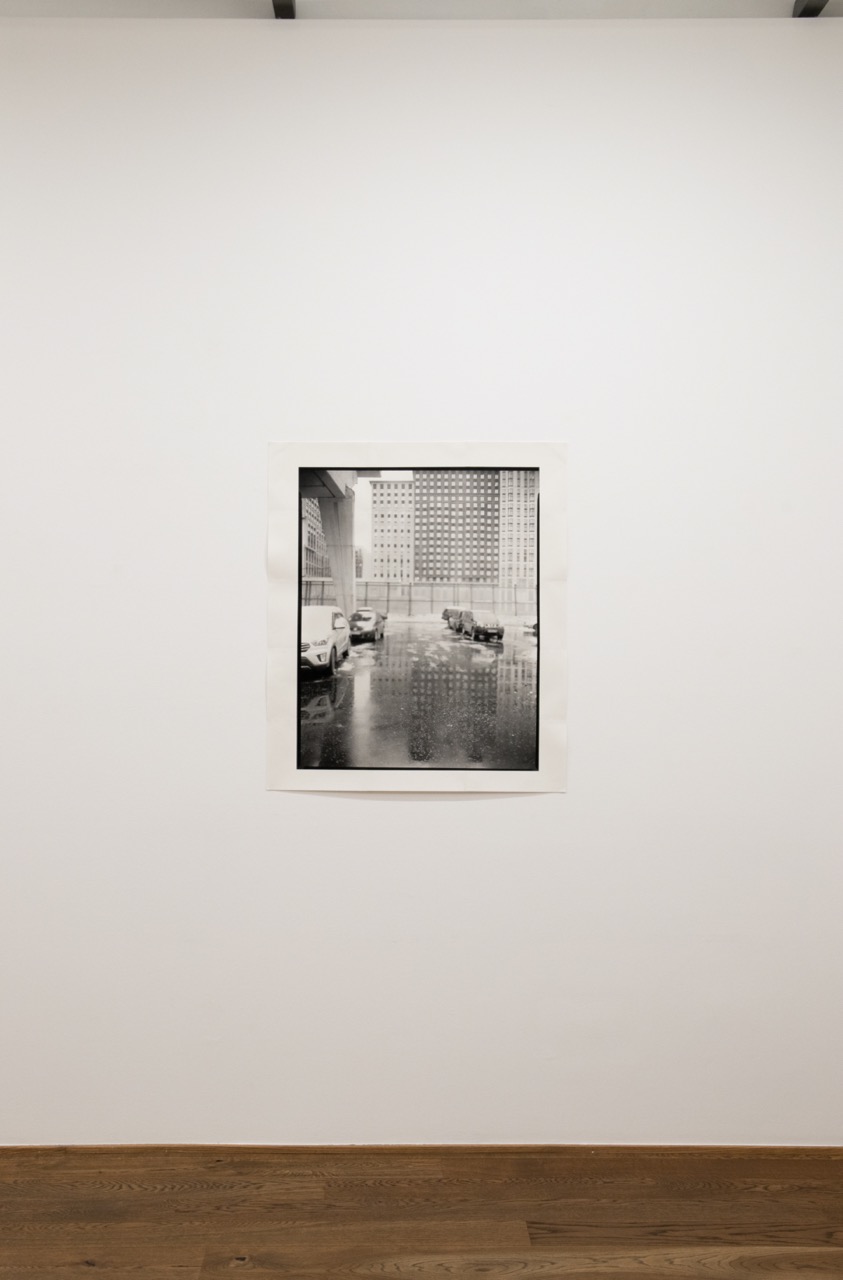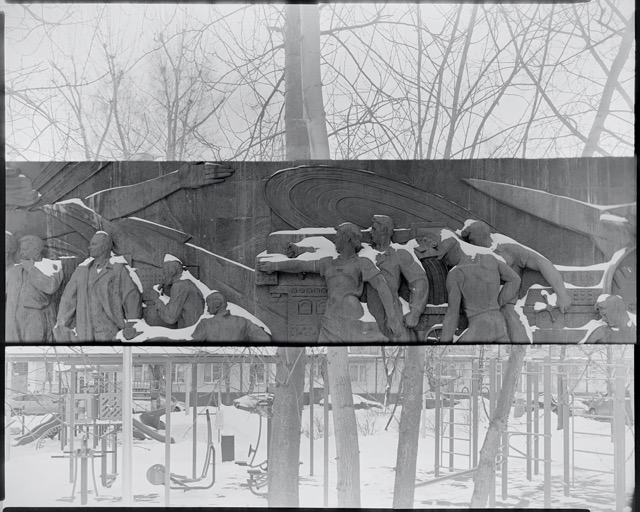 La separazione tra le due figure indica il vero punto di rottura e i processi di ricostruzione dell’immagine, che anche nelle fotografie si esprime nella stampa di singoli fogli rettangolari, successivamente assemblati a formare un insieme. La scelta del bianco e nero è adatta a restituire oggettività e chiarezza di dettagli, oltre ad accentuare il contrasto tra gli elementi costitutivi nel senso di una loro vaghezza, altro segnale di apertura. La griglia composta dall’unione dei formati A4 riprende lo schema del panel building, il modulo abitativo delle case popolari prefabbricate costruite in Russia a partire dagli anni ’60, sfondo ad alcune delle vedute. Unità di misura che segna un passaggio concettuale, dove lo spazio di oggetto, architettura e monumento finisce per regolare i sogni e l’immaginazione stessa di chi lo vive.