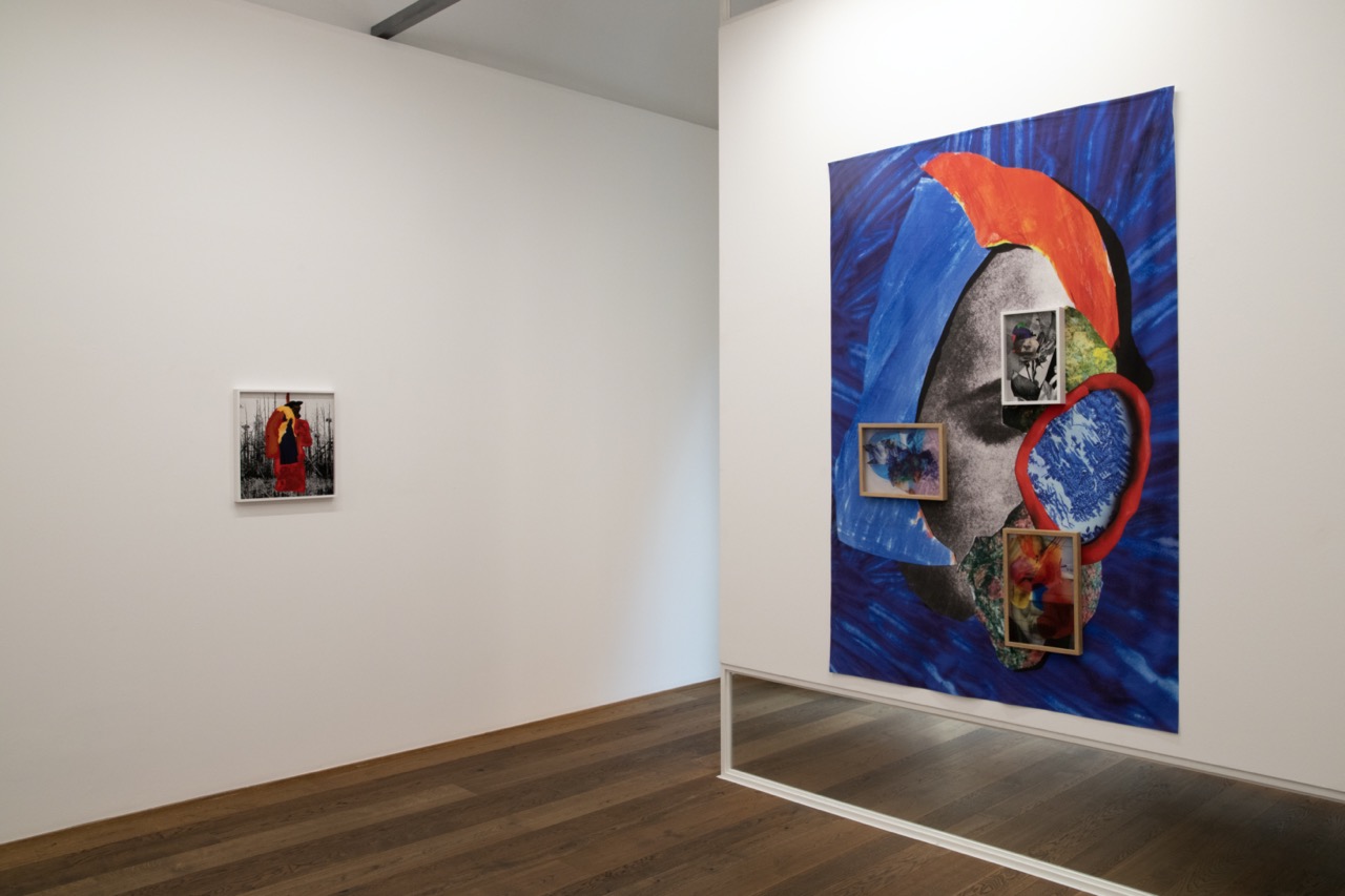 Per l’occasione sono quindi presentati otto collage fotografici dell’autrice, con l’impiego anche dell’acquerello, e la stampa a raggi ultravioletti di immagini dipinte su alcuni frammenti di argilla. Un allestimento chiaro e ben ragionato all’interno del percorso di visita, ci restituisce nel pannello retrostante l’ingresso proprio l’opera di maggiori dimensioni, For the sake of the image, the emerging withdraws to you. Disposta frontalmente alle due figure disegnate da Marzorati, in dialogo sul fondo dello spazio, contiene appese altre tre opere della stessa Hannula, enfatizzando il concetto e la medesima pratica del collage.